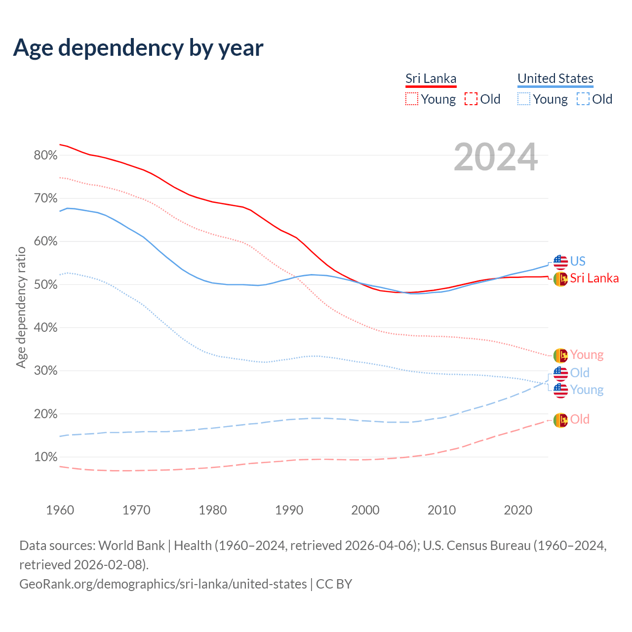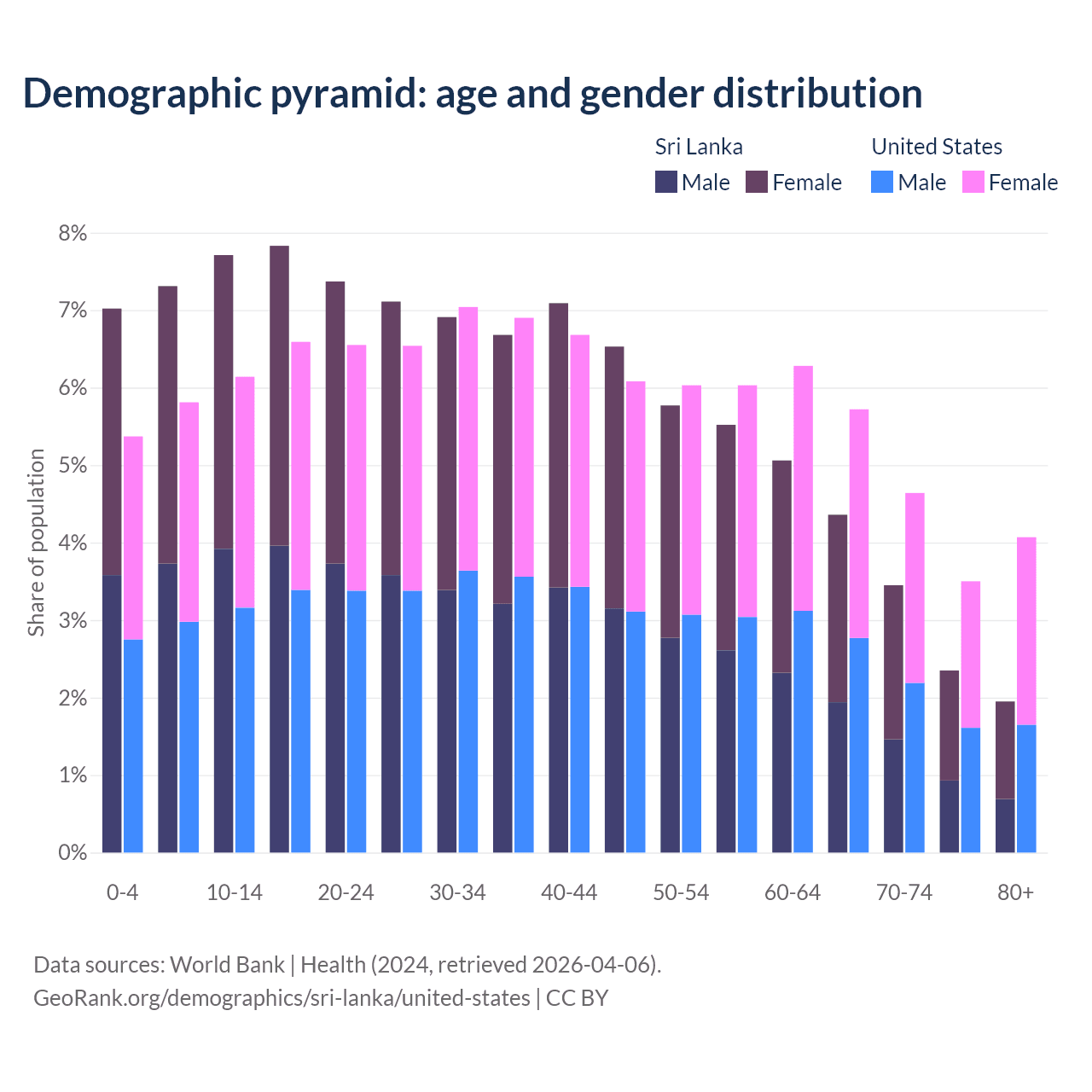 - Sri Lanka is ranked 81/196 by median age (oldest to youngest) vs 50/196 for the United States.