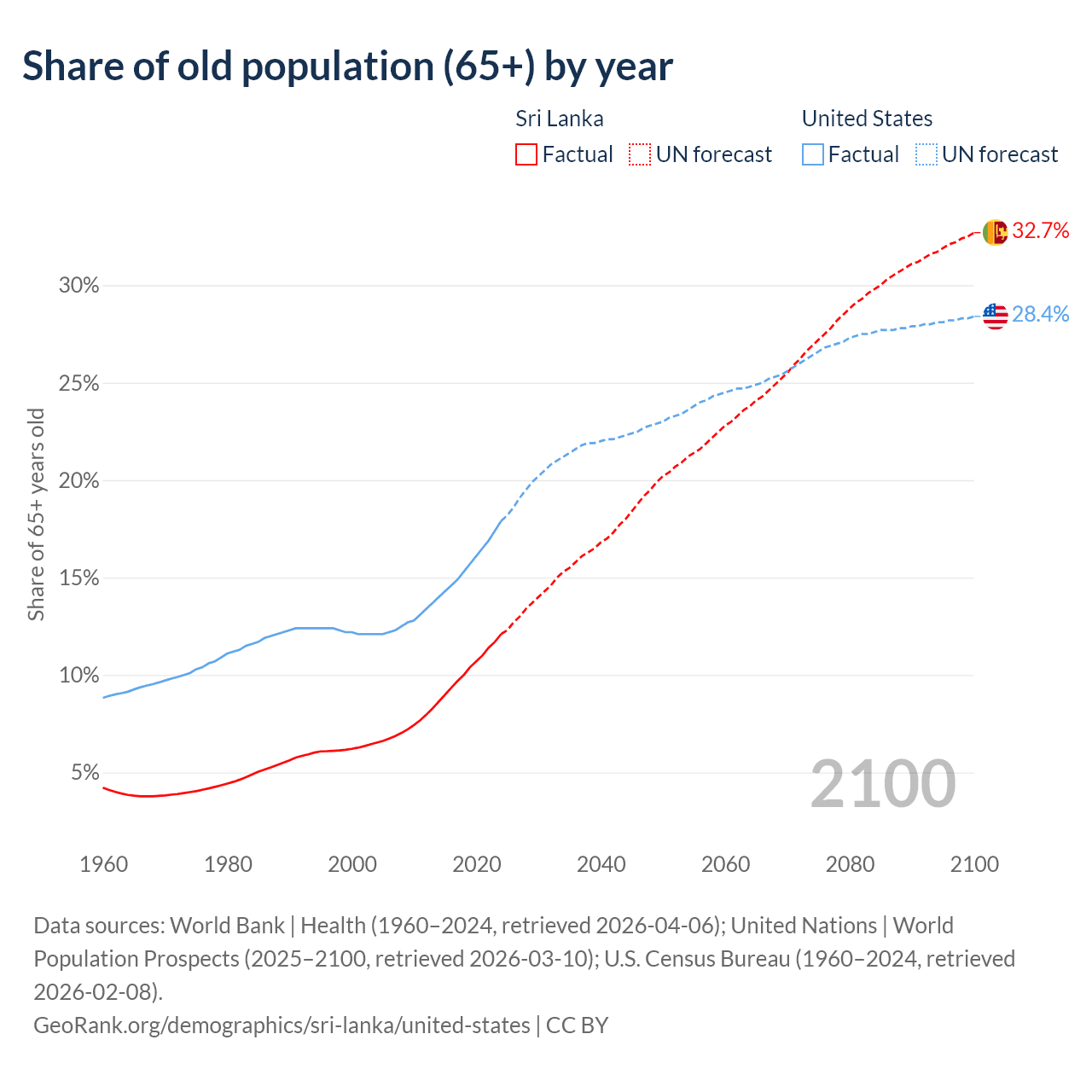 The share of older people aged 65 and over is 12.1% in Sri Lanka and 17.9% in the United States. Life expectancy in Sri Lanka compared to the United States .