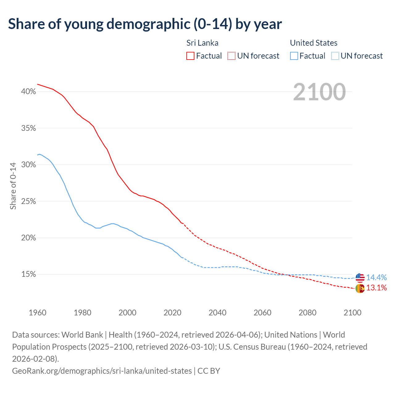 - The share of young demographic (0-15 years old) in Sri Lanka is 22% vs 17.3% in the United States.
