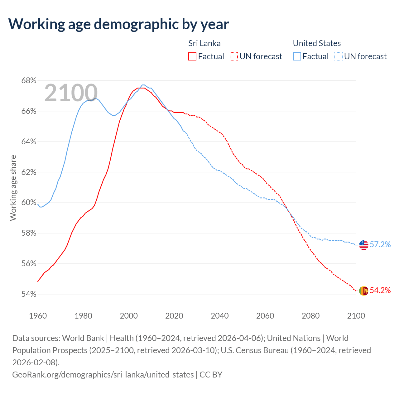 - Sri Lanka has 14.6M working age adults (aged 15-64) vs 223M in the United States.