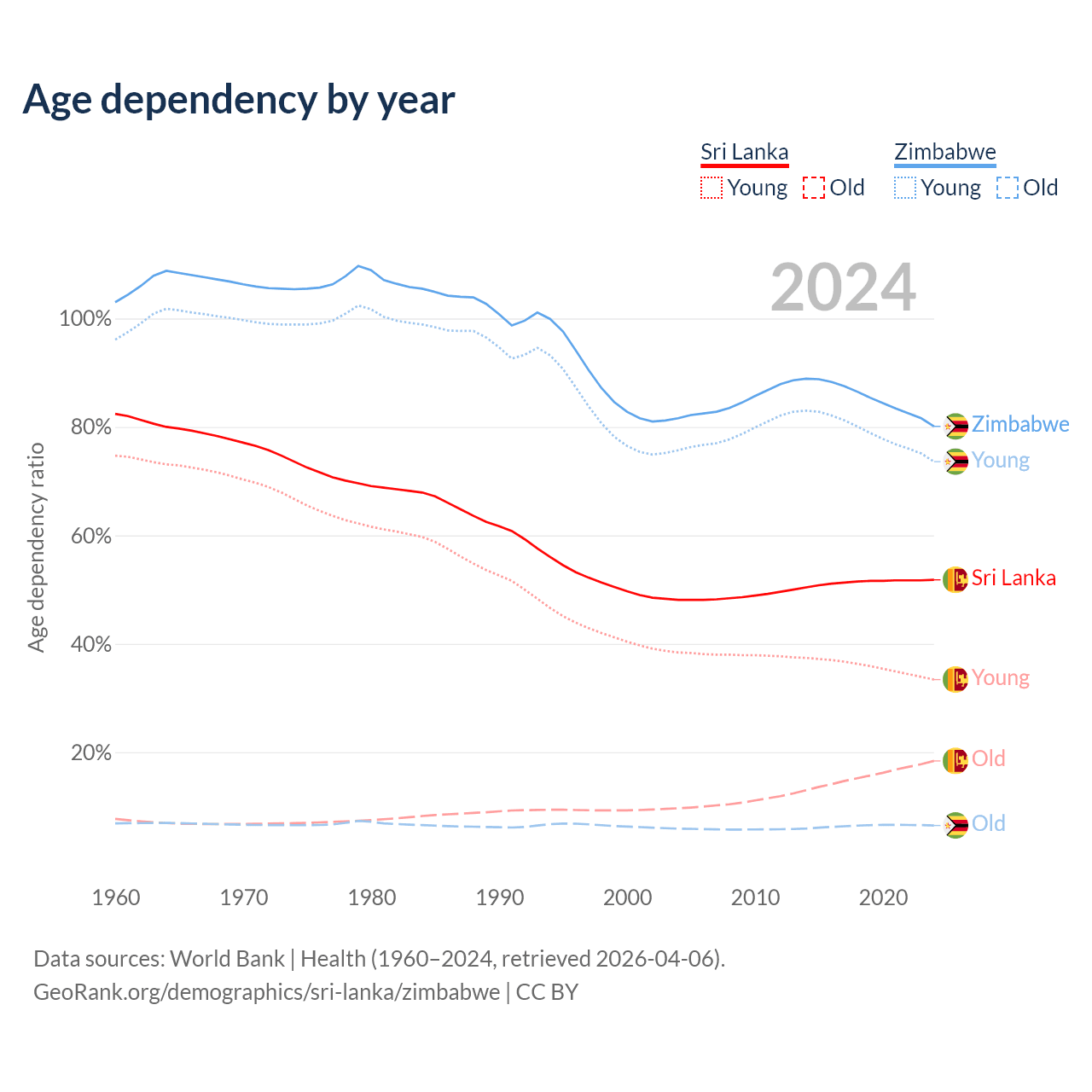 - Sri Lanka is ranked 81/196 by median age (oldest to youngest) vs 177/196 for Zimbabwe.