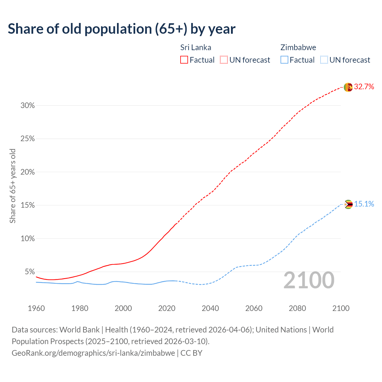 The share of older people aged 65 and over is 12.1% in Sri Lanka and 3.6% in Zimbabwe. Life expectancy in Sri Lanka compared to Zimbabwe .
