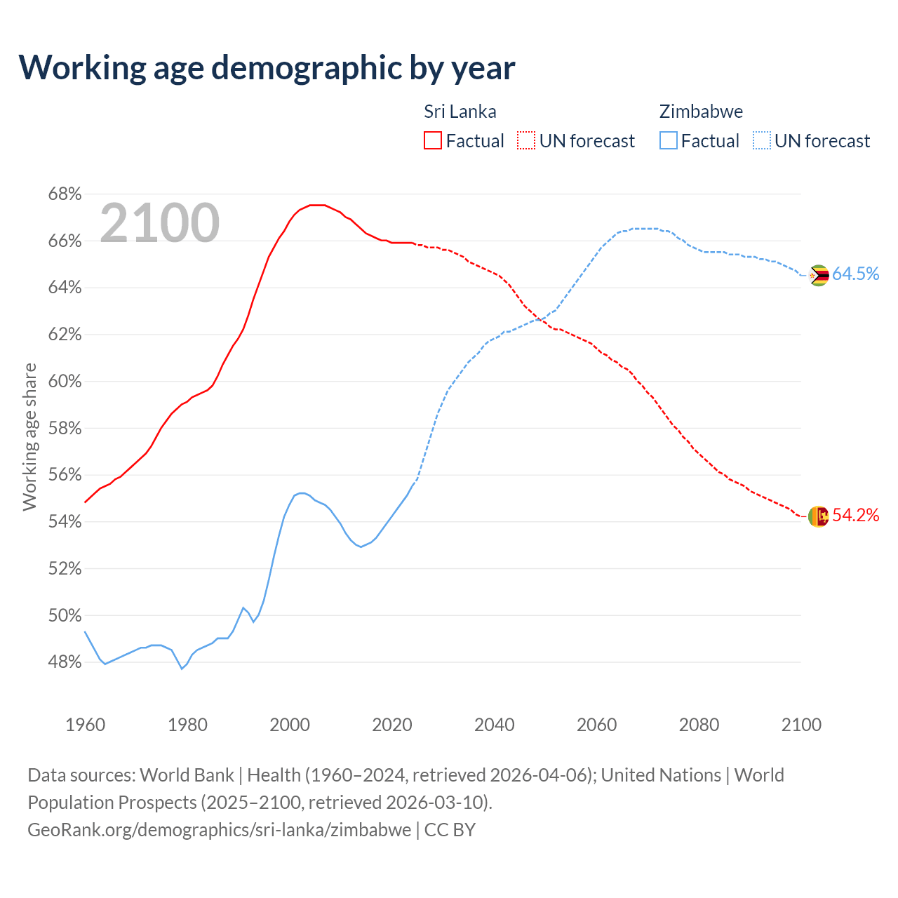 Median age Sri Lanka vs Zimbabwe, 1960-2100
