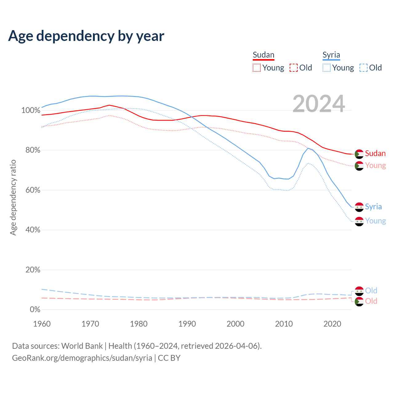- Sudan is ranked 172/196 by median age (oldest to youngest) vs 138/196 for Syria.
