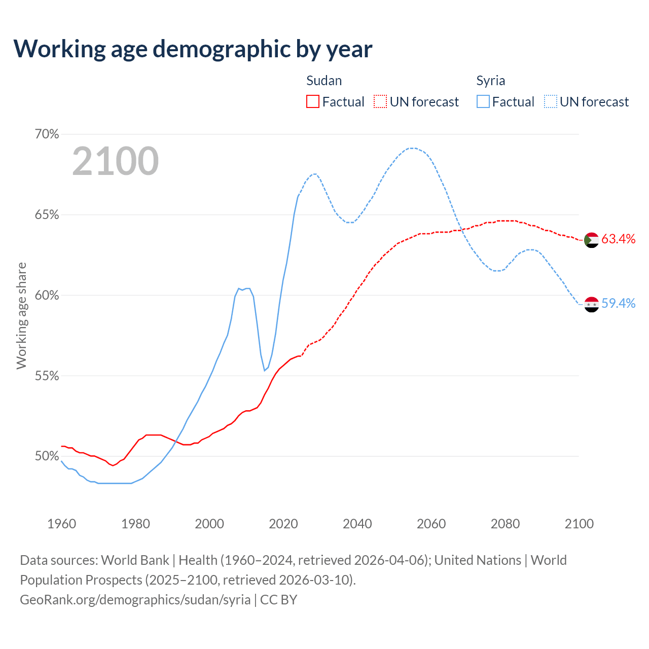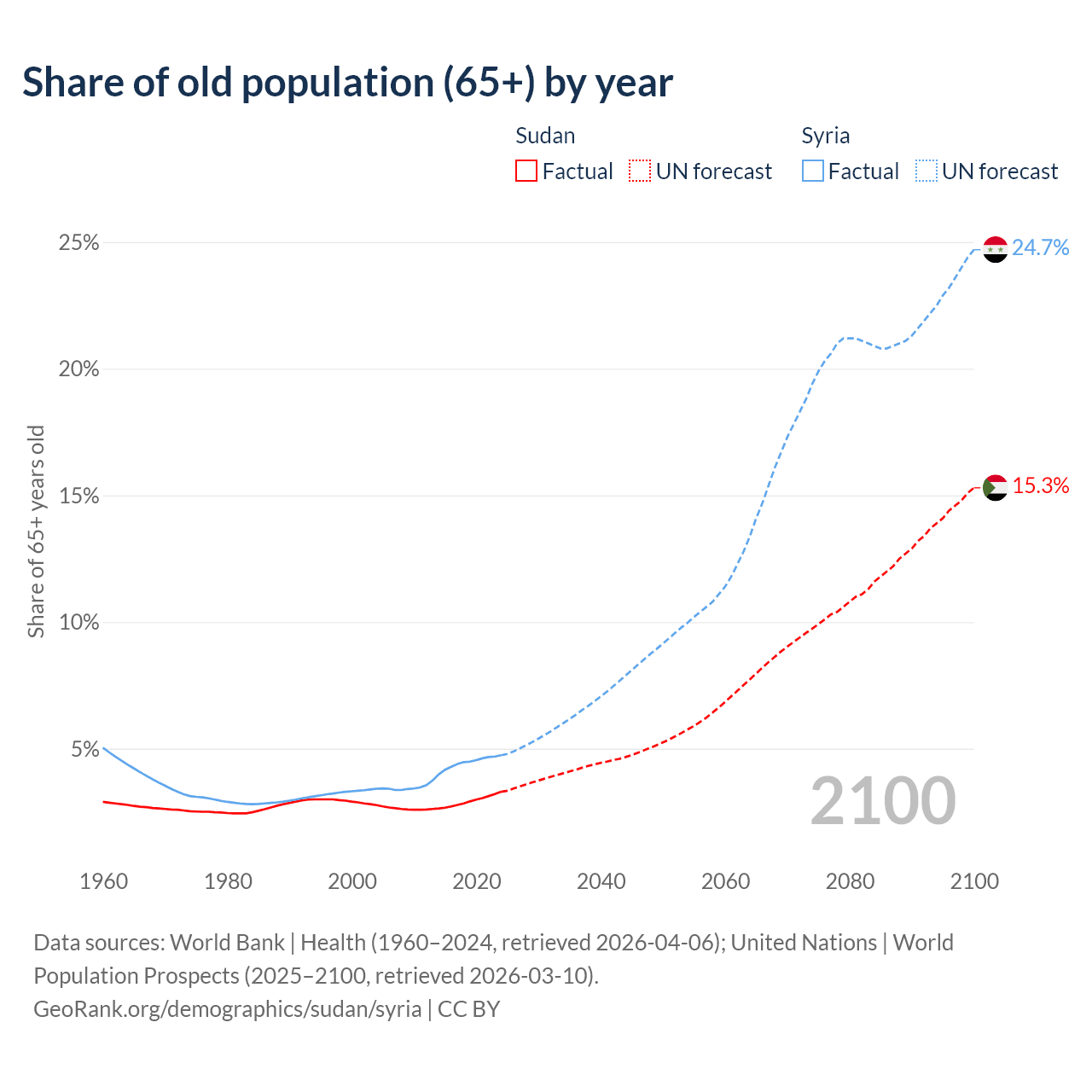 The share of older people aged 65 and over is 3.3% in Sudan and 4.74% in Syria. Life expectancy in Sudan compared to Syria .