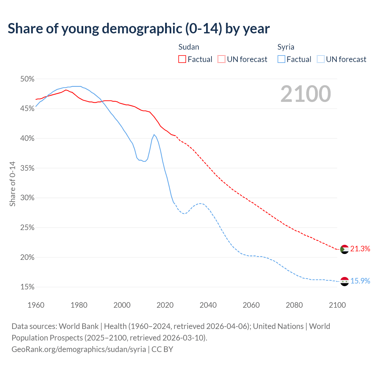 - The share of young demographic (0-15 years old) in Sudan is 40.5% vs 29.2% in Syria.