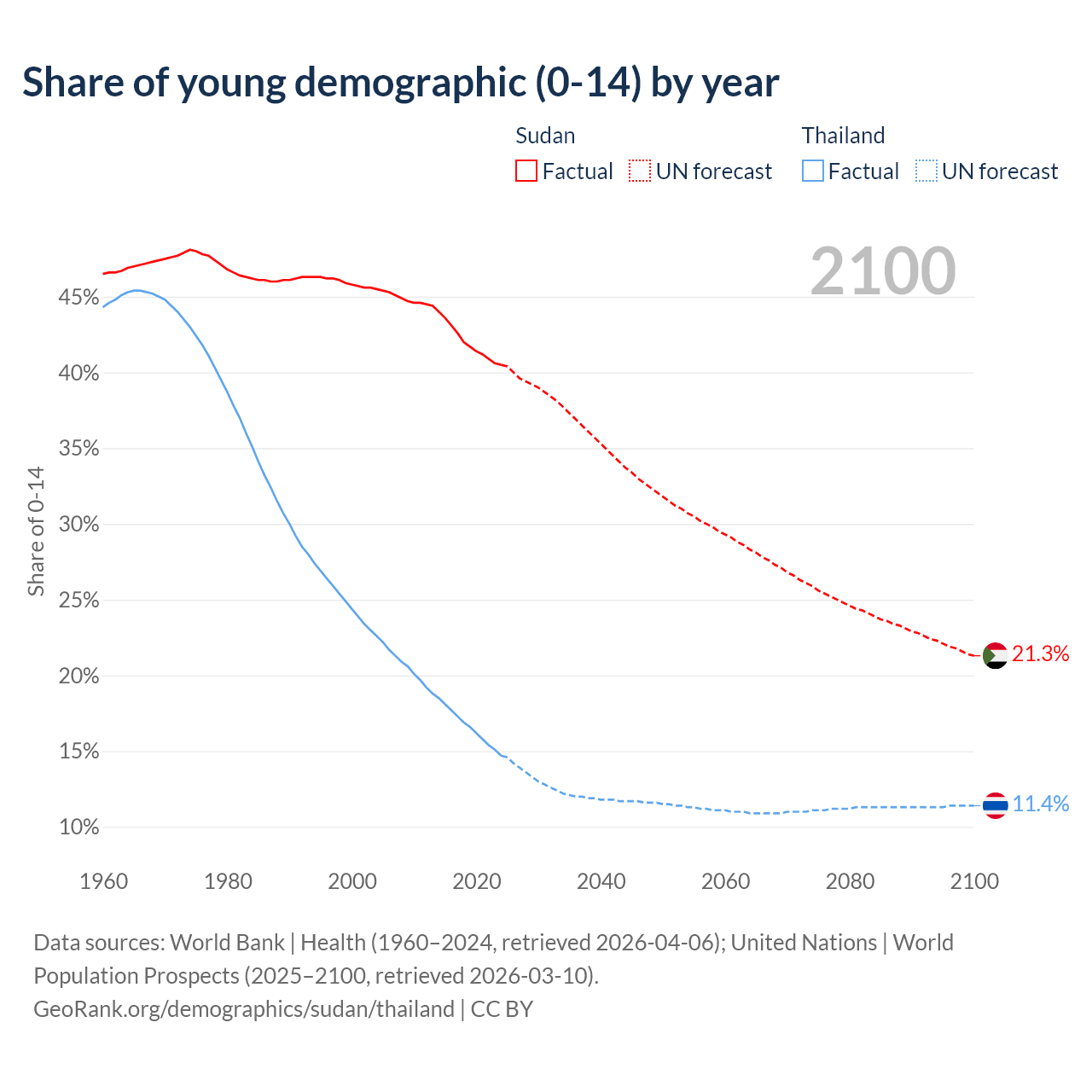 - The share of young demographic (0-15 years old) in Sudan is 40.5% vs 14.7% in Thailand.