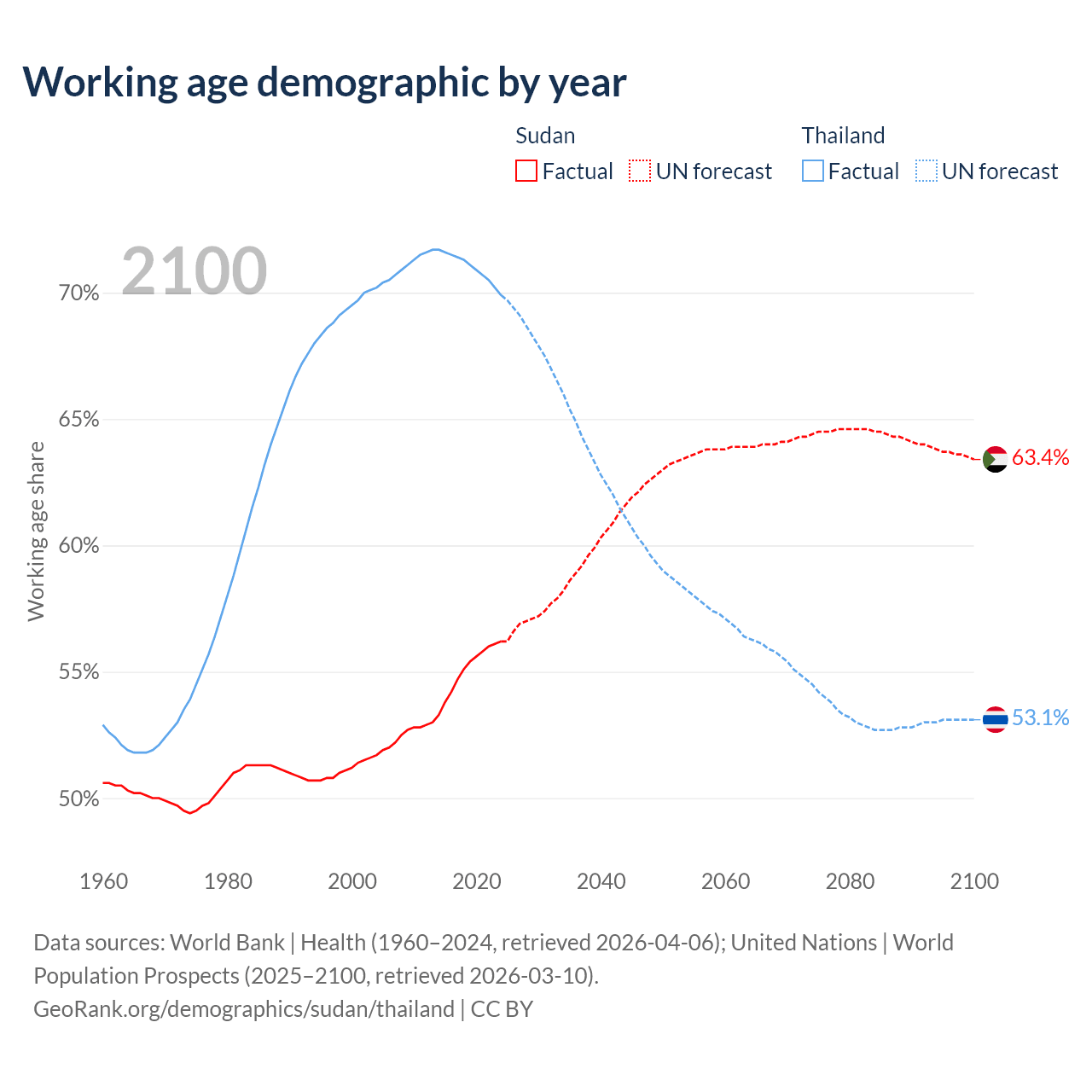 - Sudan has 30M working age adults (aged 15-64) vs 50M in Thailand.