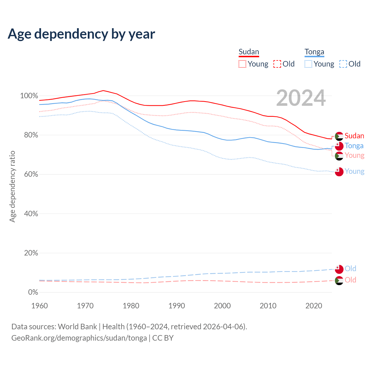 The share of older people aged 65 and over is 3.3% in Sudan and 6.72% in Tonga. Life expectancy in Sudan compared to Tonga .