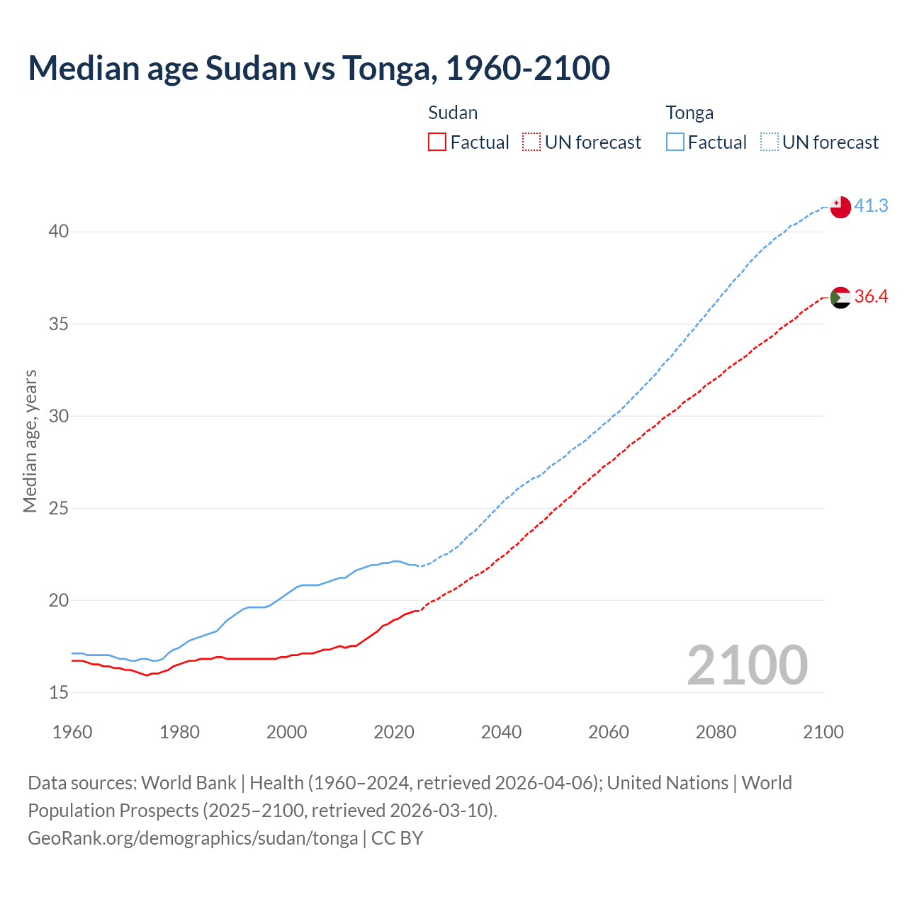 Median age Sudan vs Tonga, 1960-2100