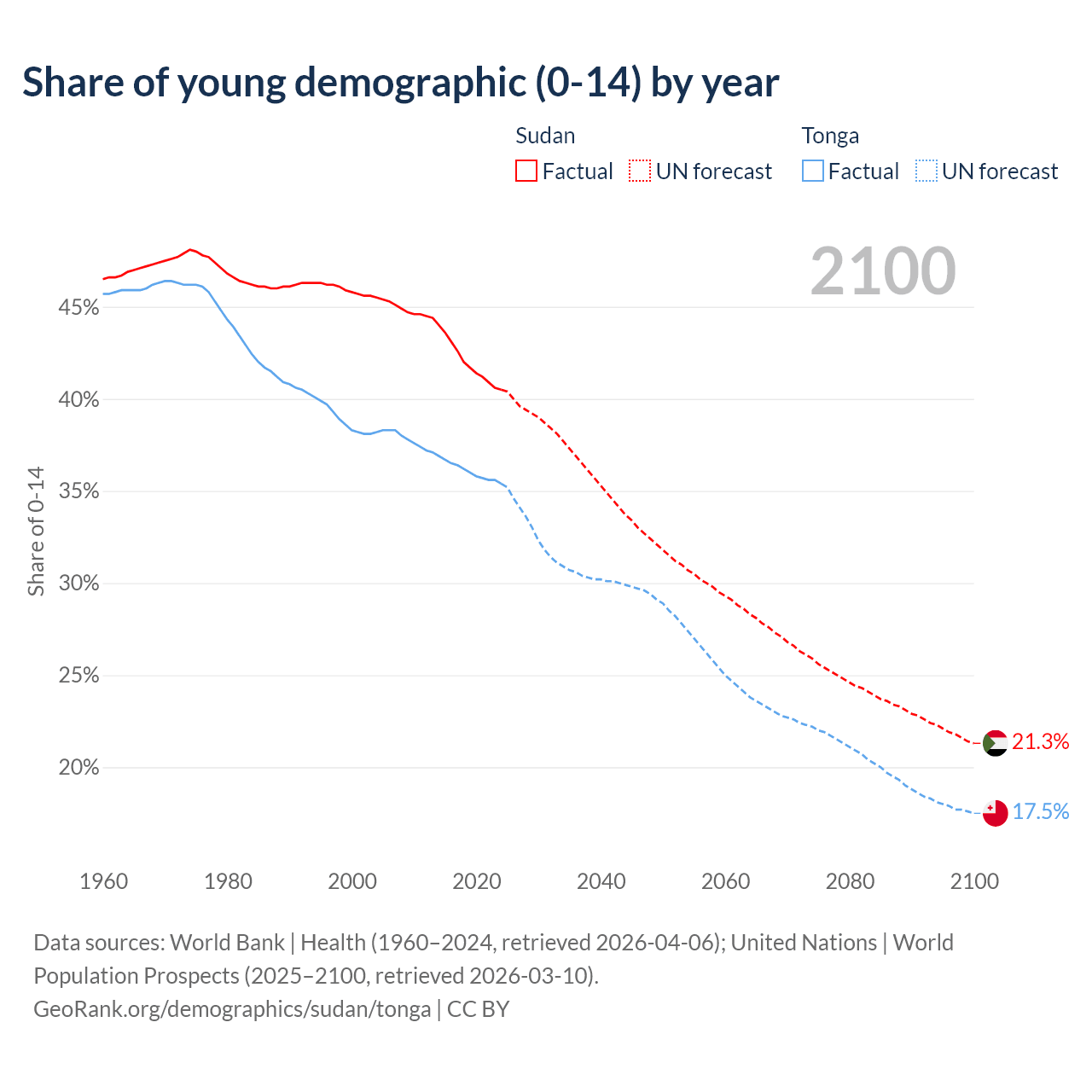 - The share of young demographic (0-15 years old) in Sudan is 40.5% vs 35.4% in Tonga.