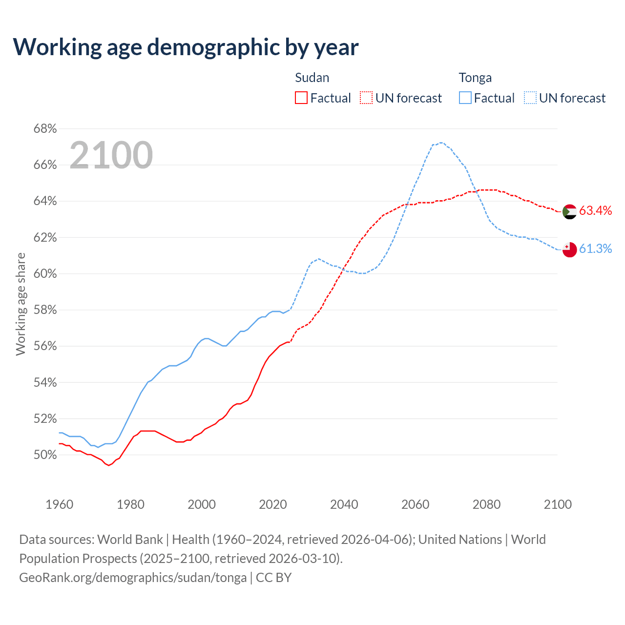 - Sudan has 30M working age adults (aged 15-64) vs 59.8K in Tonga.
