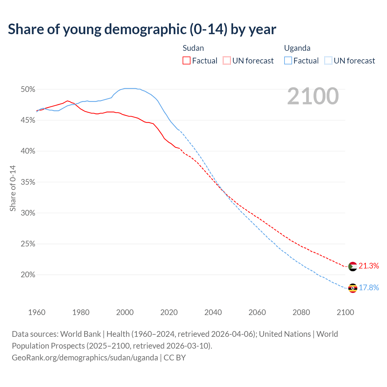 Median age Sudan vs Uganda, 1960-2100