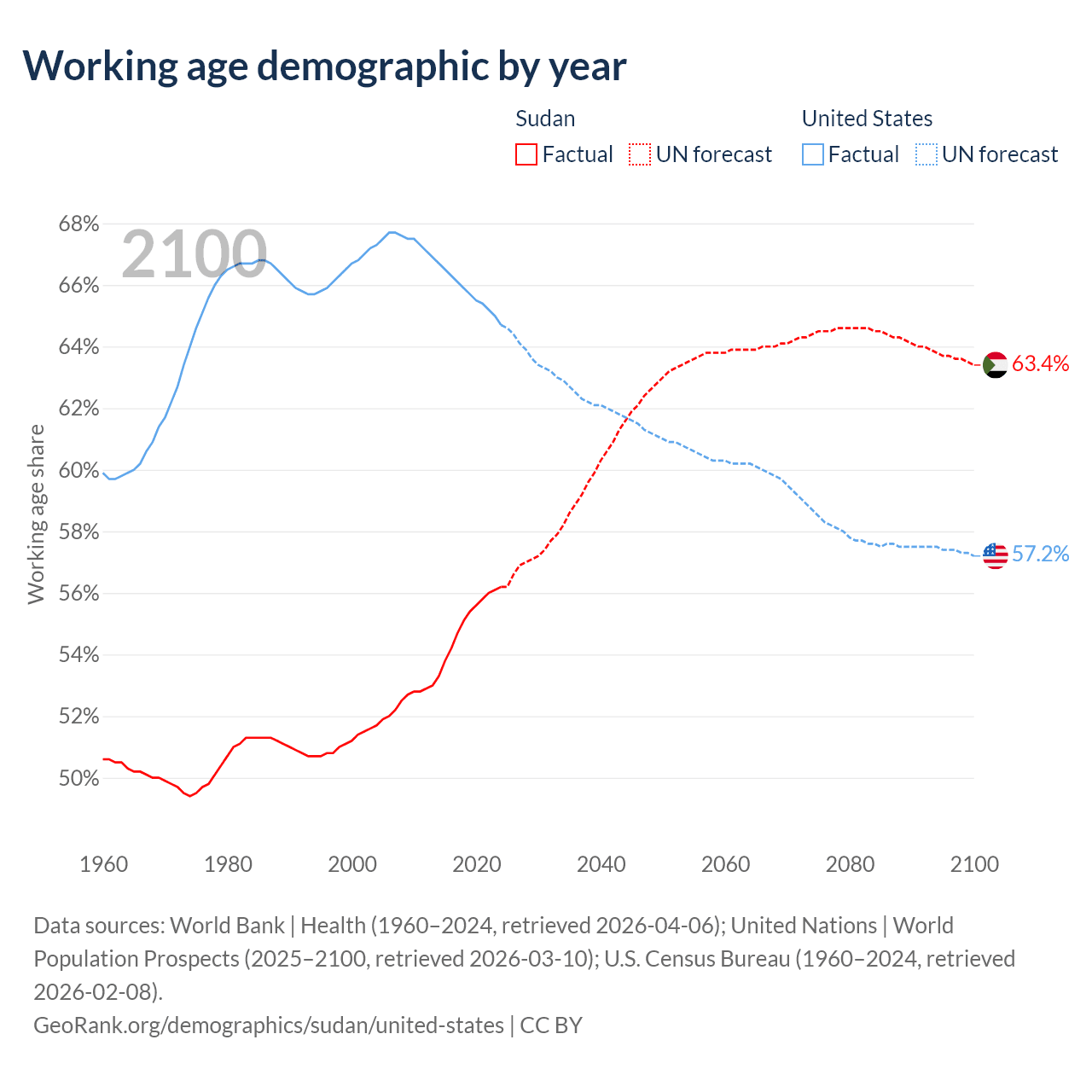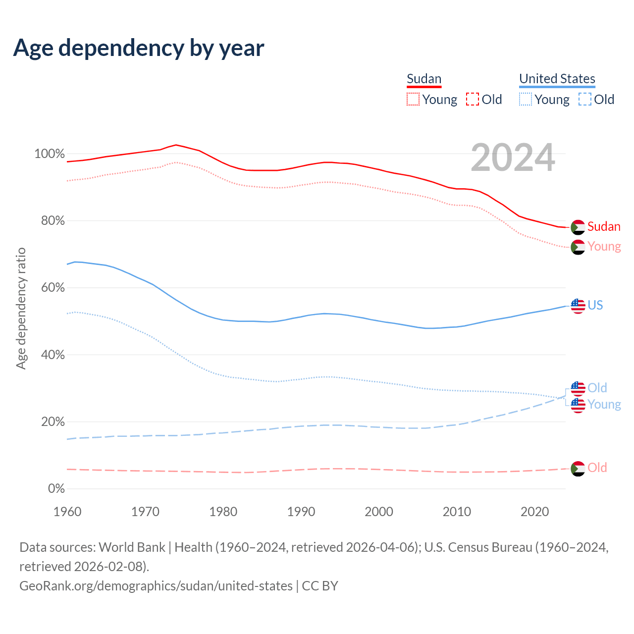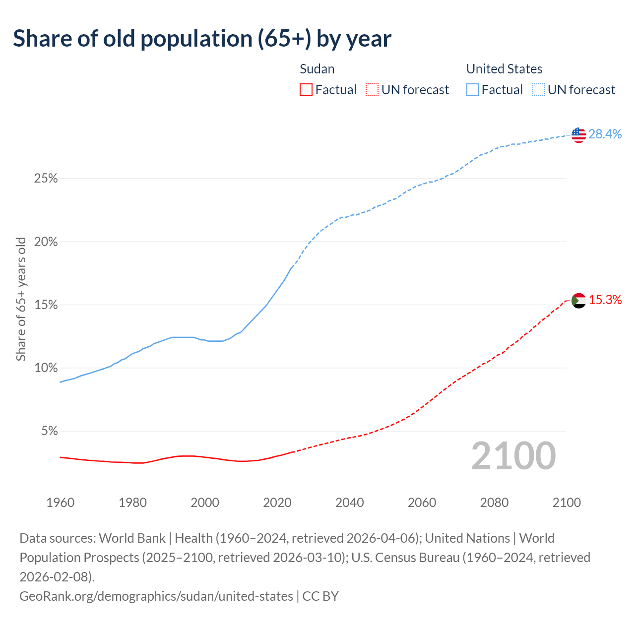 The share of older people aged 65 and over is 3.3% in Sudan and 17.9% in the United States. Life expectancy in Sudan compared to the United States .
