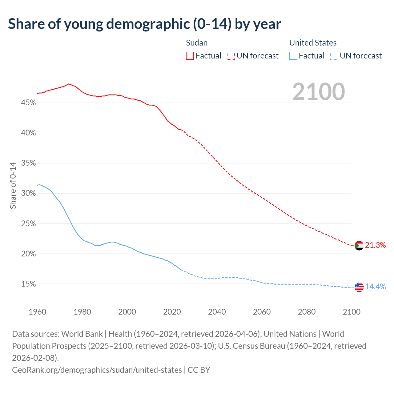 - The share of young demographic (0-15 years old) in Sudan is 40.5% vs 17.3% in the United States.