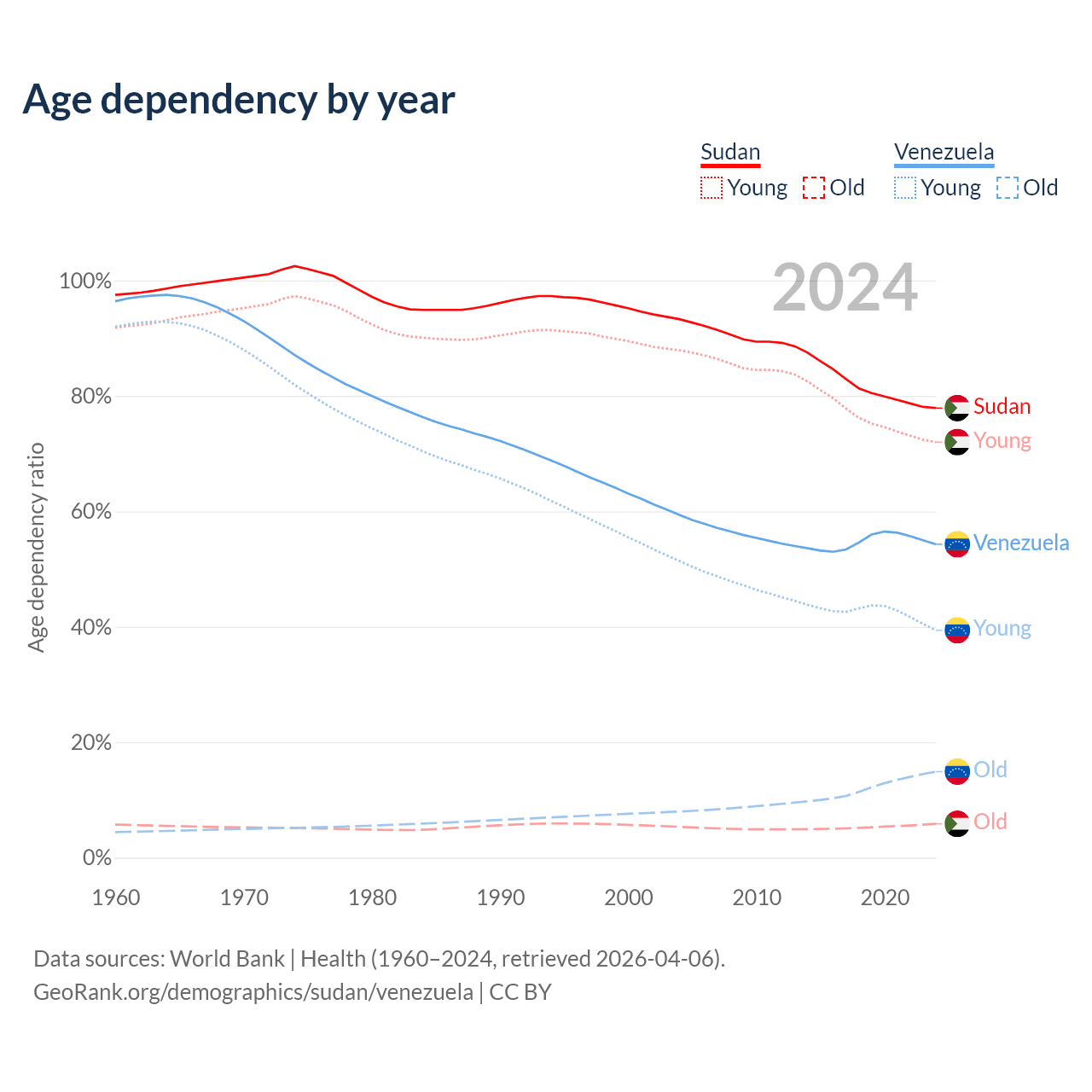 - Sudan is ranked 172/196 by median age (oldest to youngest) vs 104/196 for Venezuela.
