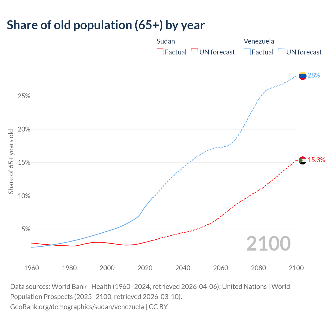 The share of older people aged 65 and over is 3.3% in Sudan and 9.68% in Venezuela. Life expectancy in Sudan compared to Venezuela .