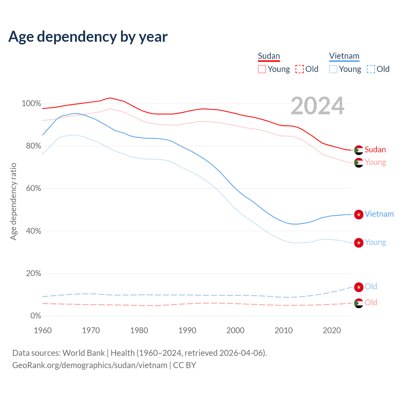 - Sudan is ranked 172/196 by median age (oldest to youngest) vs 84/196 for Vietnam.