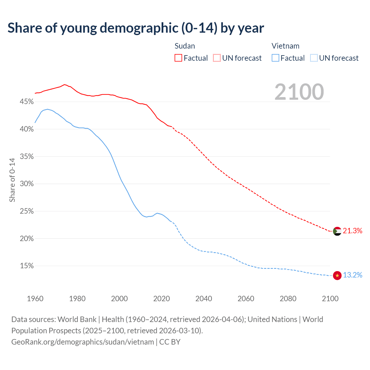 - The share of young demographic (0-15 years old) in Sudan is 40.5% vs 23.2% in Vietnam.