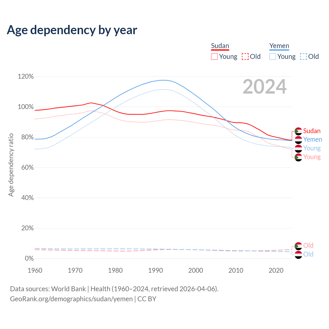 - Sudan is ranked 172/196 by median age (oldest to youngest) vs 174/196 for Yemen.