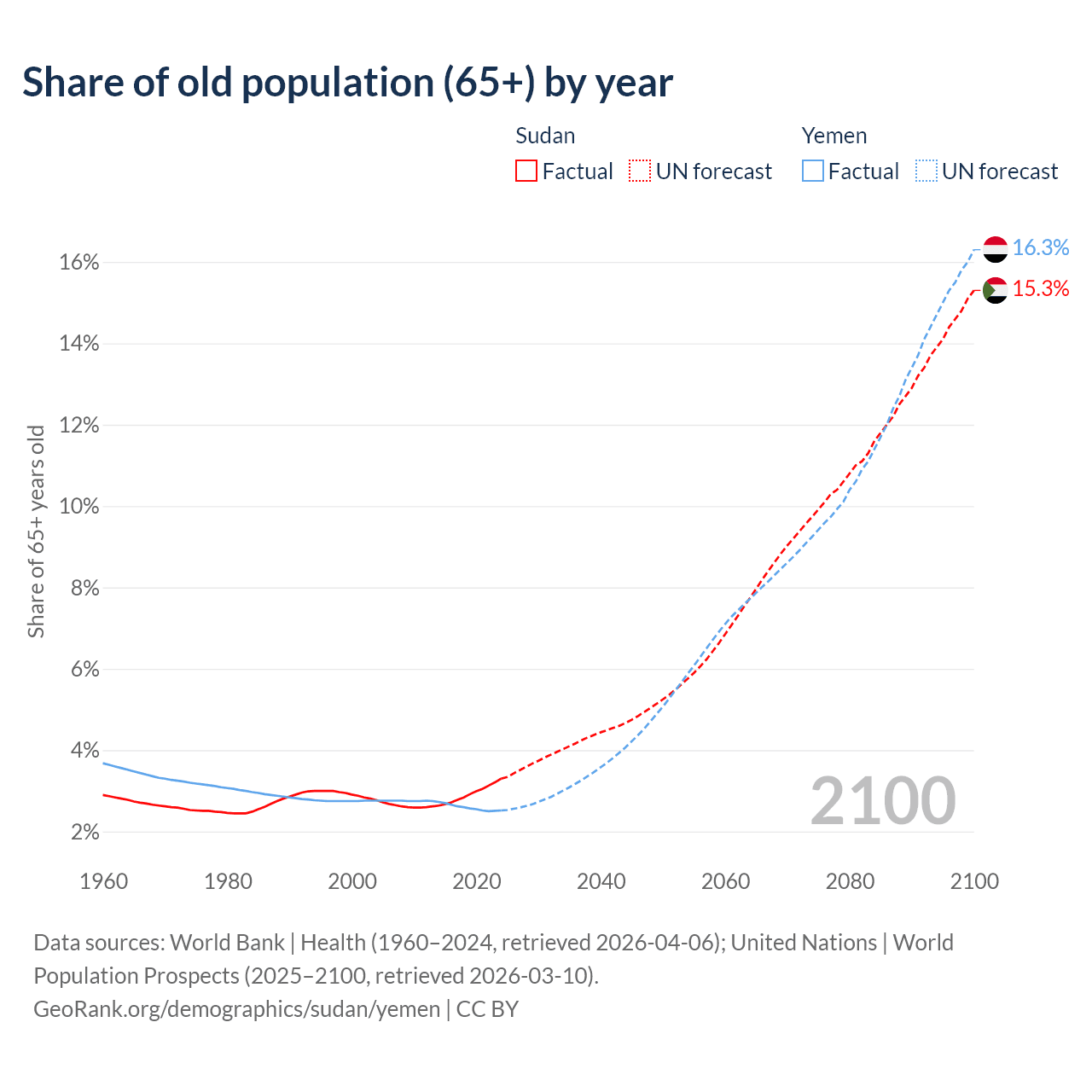 The share of older people aged 65 and over is 3.3% in Sudan and 2.52% in Yemen. Life expectancy in Sudan compared to Yemen .