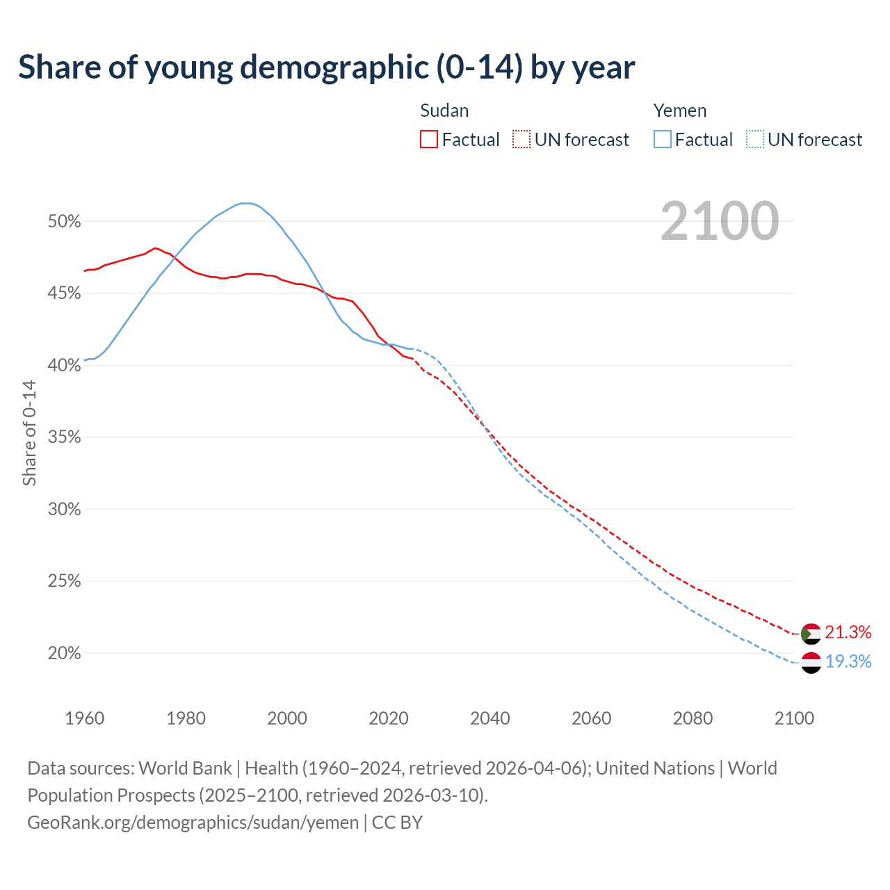 - The share of young demographic (0-15 years old) in Sudan is 40.5% vs 41.1% in Yemen.