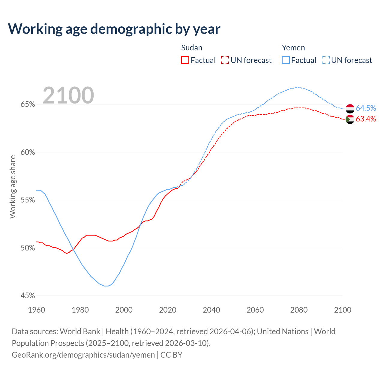 - Sudan has 30M working age adults (aged 15-64) vs 24.4M in Yemen.