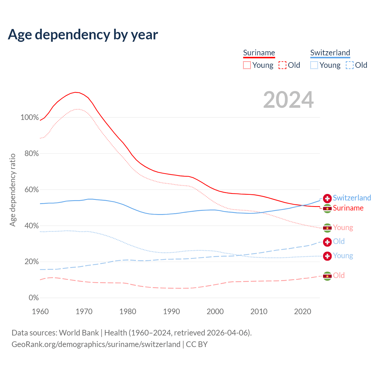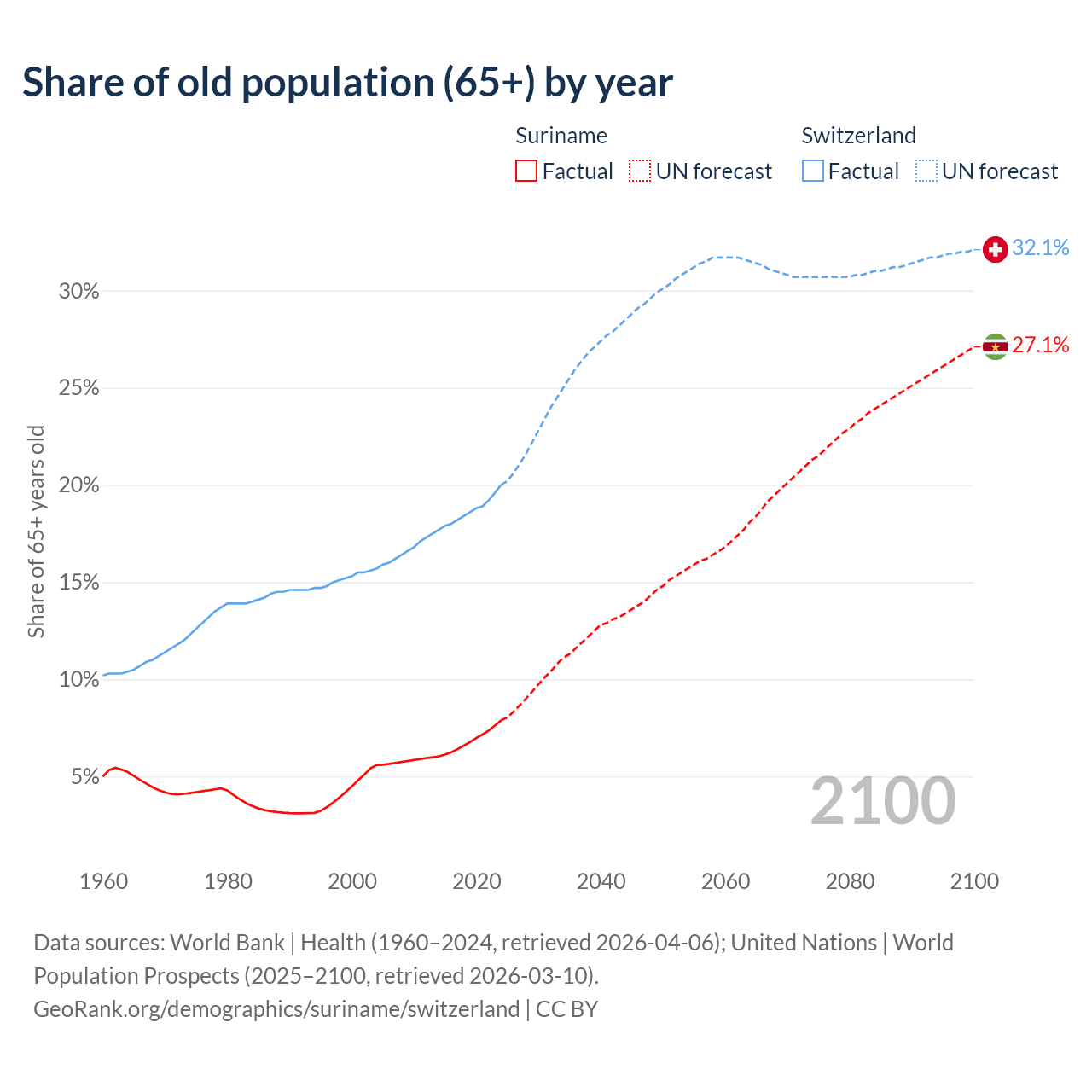 The share of older people aged 65 and over is 7.9% in Suriname and 20% in Switzerland. Life expectancy in Suriname compared to Switzerland .
