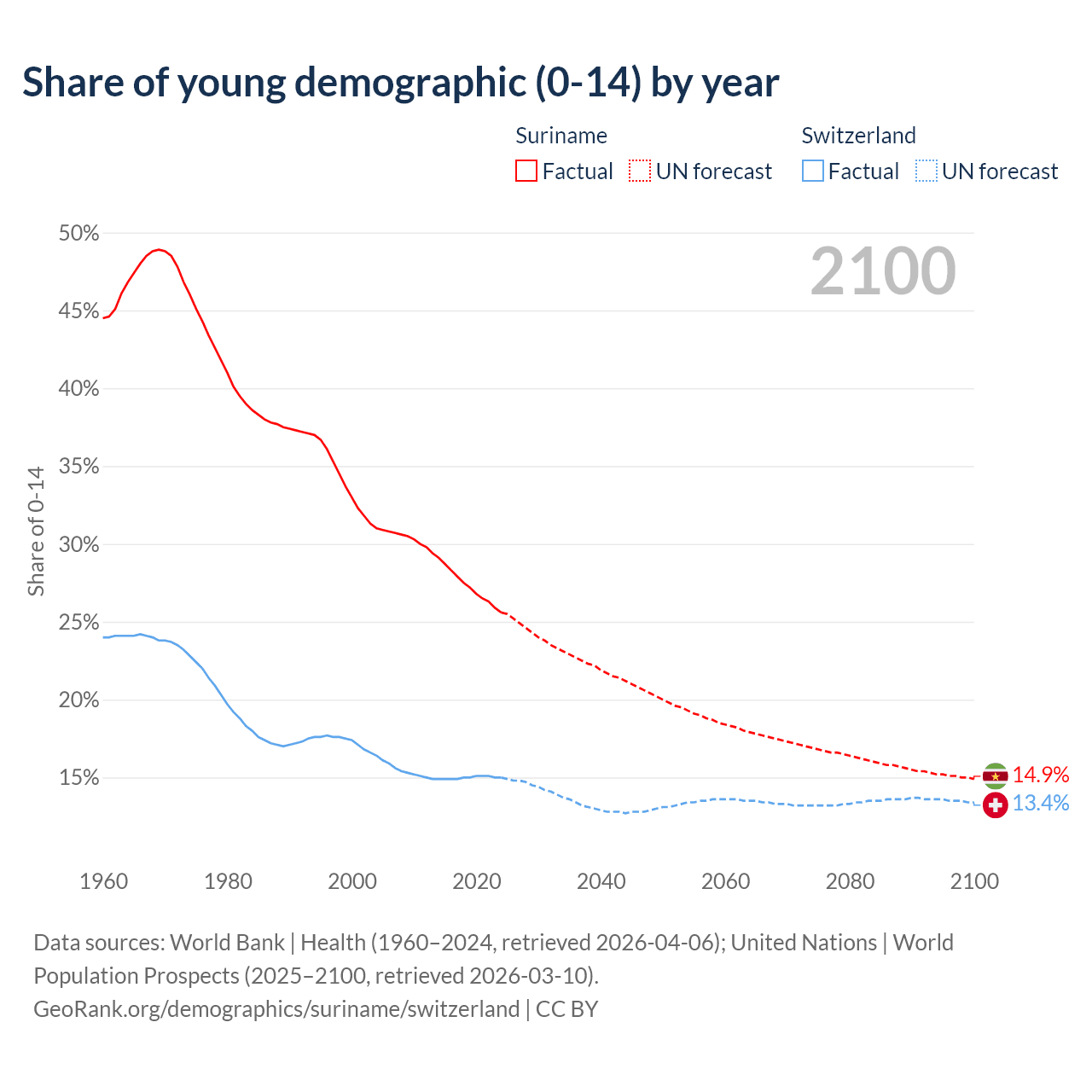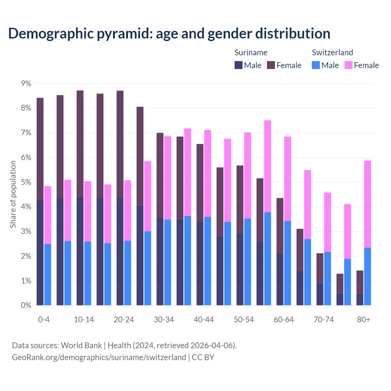 - The share of young demographic (0-15 years old) in Suriname is 25.6% vs 15% in Switzerland.