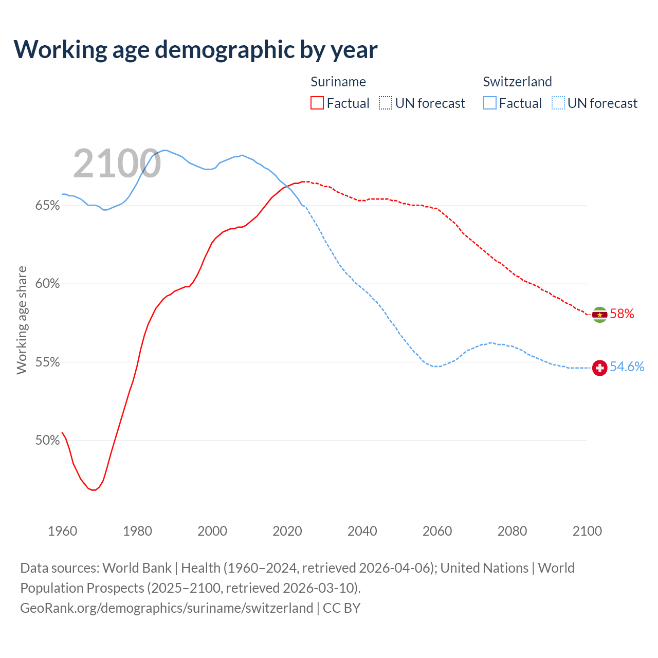 Median age Suriname vs Switzerland, 1960-2100