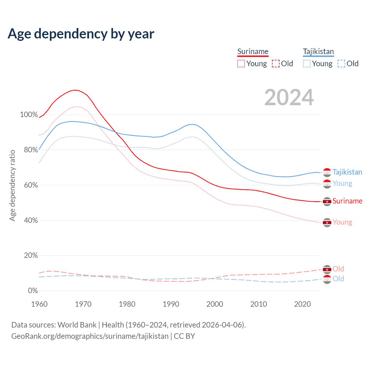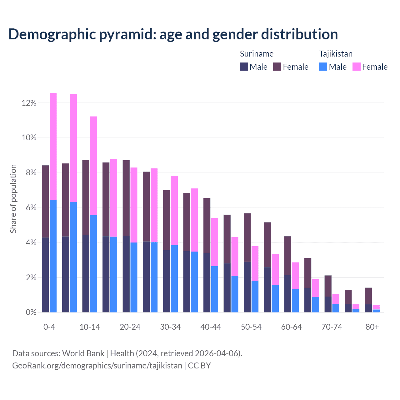 - Suriname is ranked 109/196 by median age (oldest to youngest) vs 142/196 for Tajikistan.