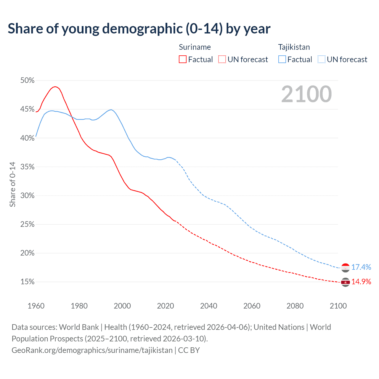 - The share of young demographic (0-15 years old) in Suriname is 25.6% vs 36.3% in Tajikistan.