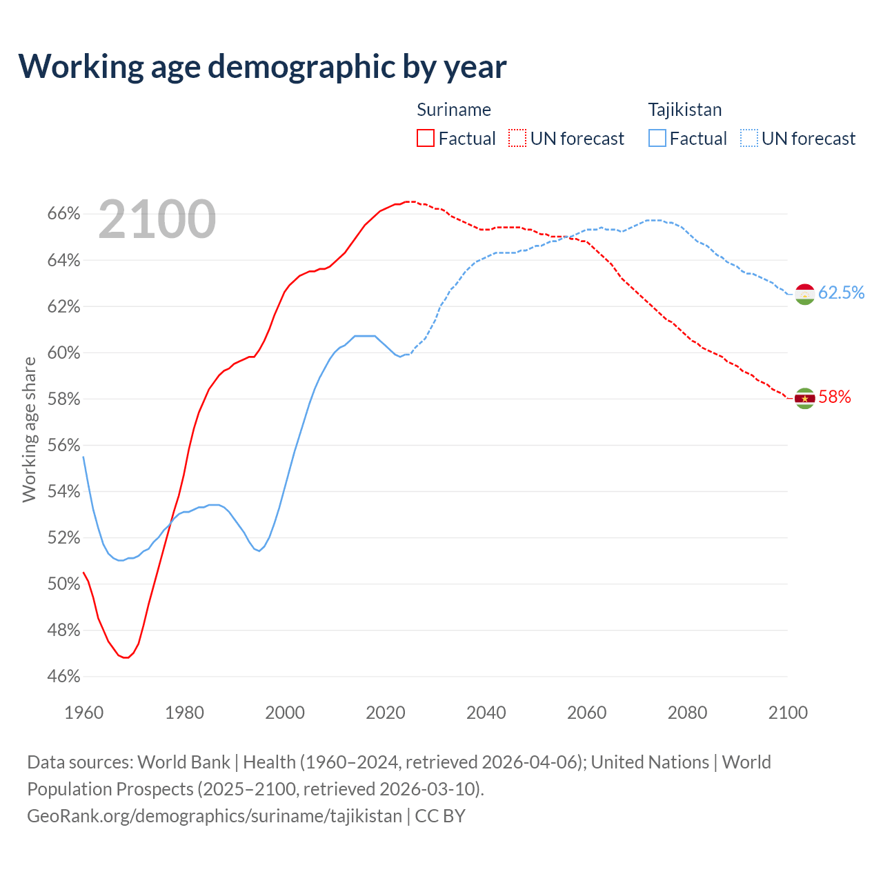 - Suriname has 430K working age adults (aged 15-64) vs 6.61M in Tajikistan.