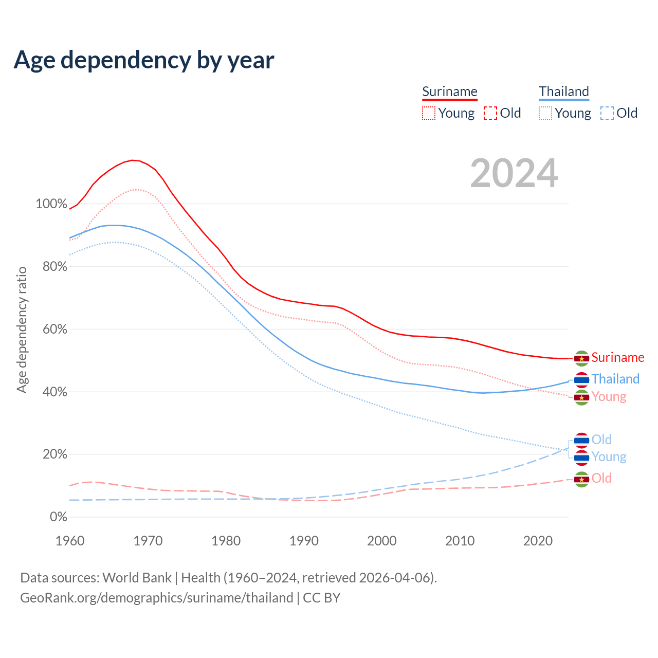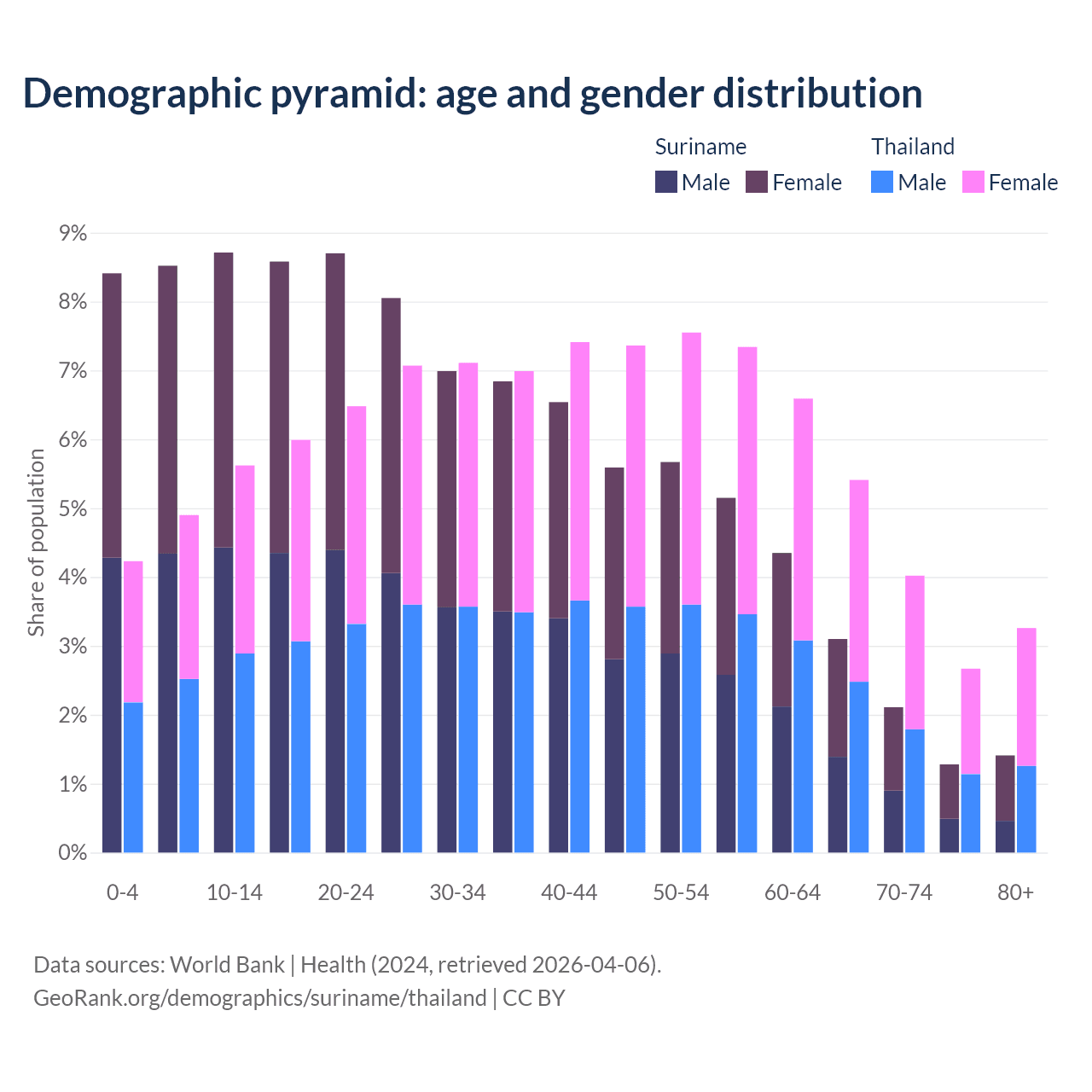 - Suriname is ranked 109/196 by median age (oldest to youngest) vs 40/196 for Thailand.