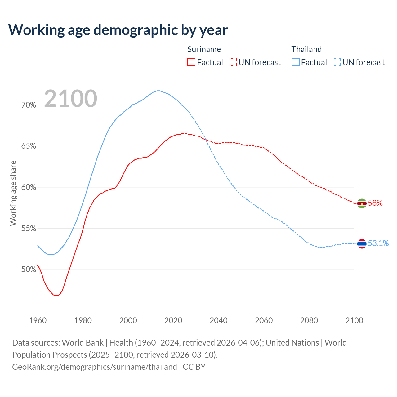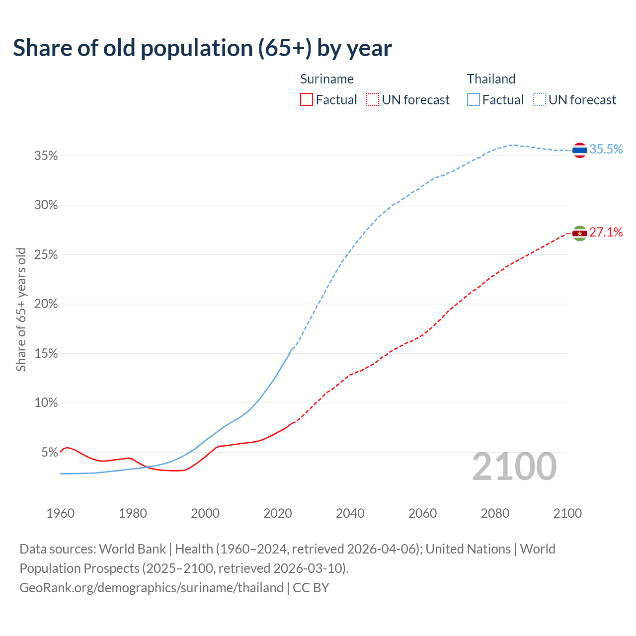 - The share of old-age demographic (65+) in Suriname is 7.9% vs 15.4% in Thailand.