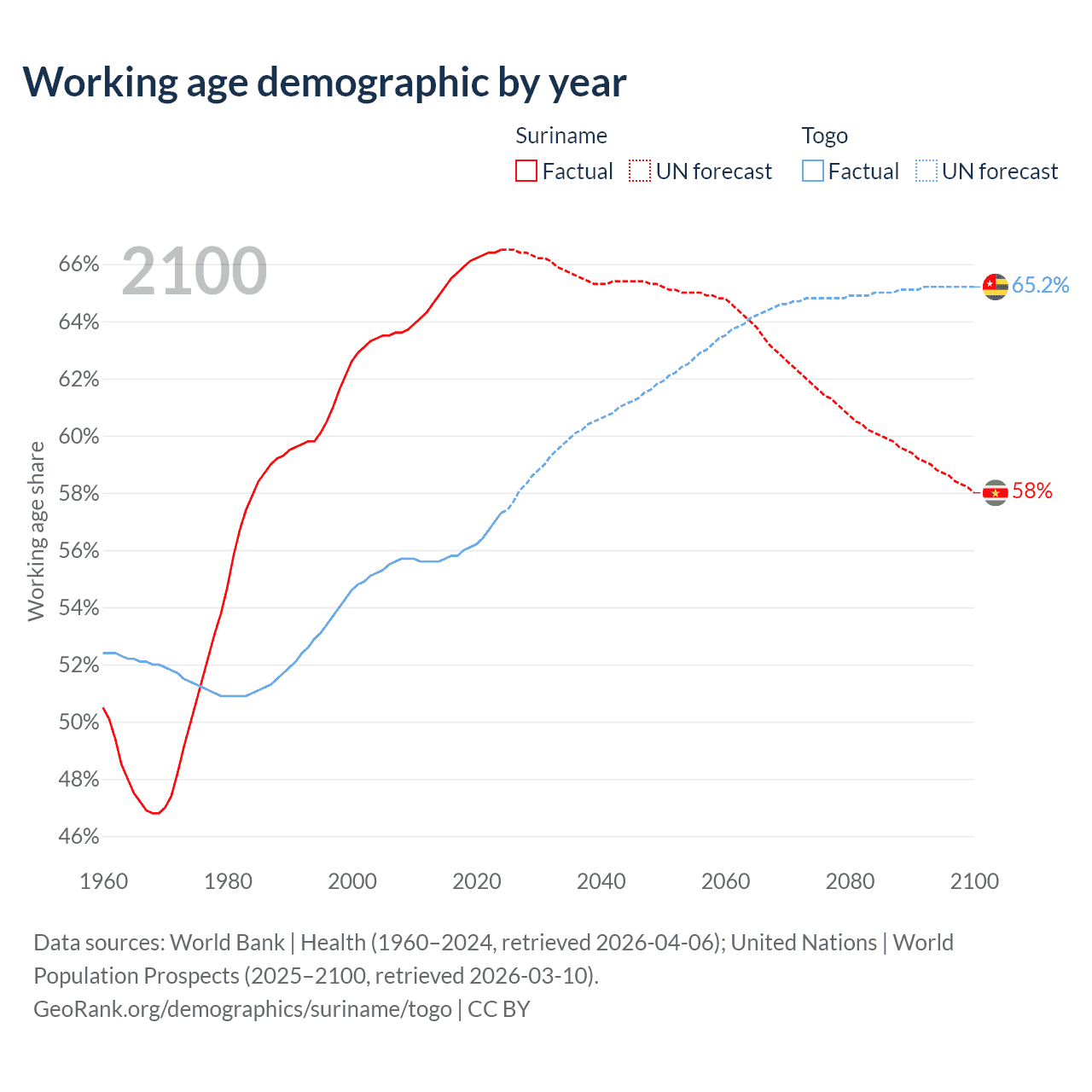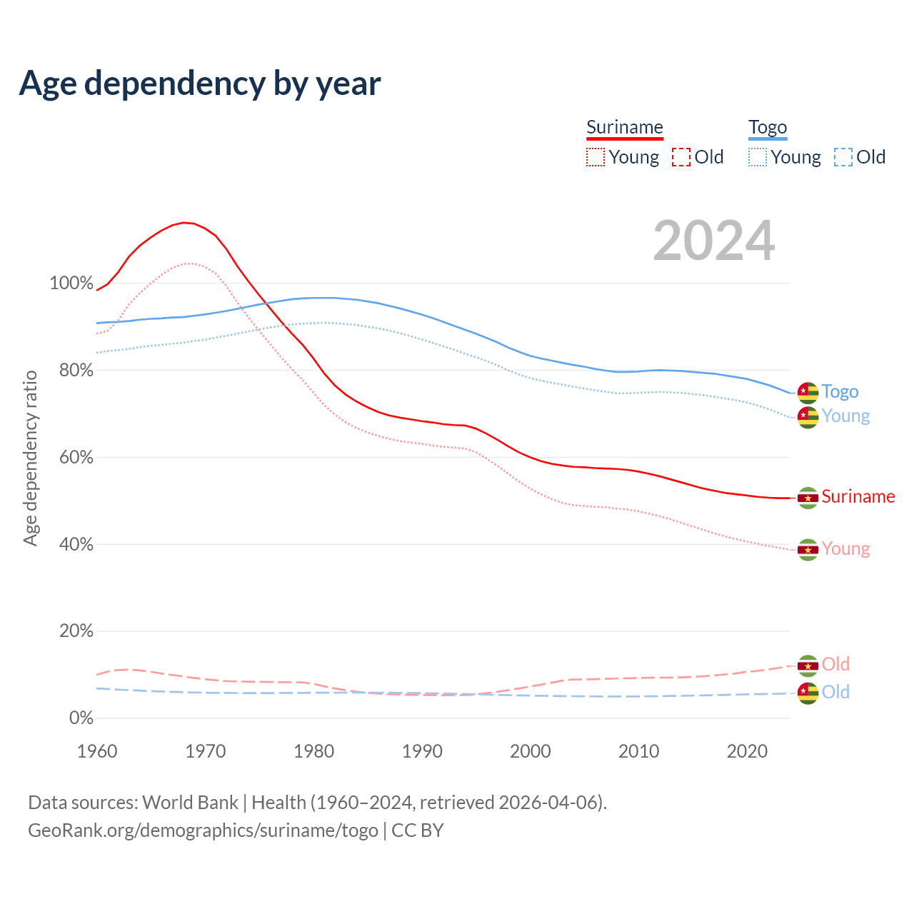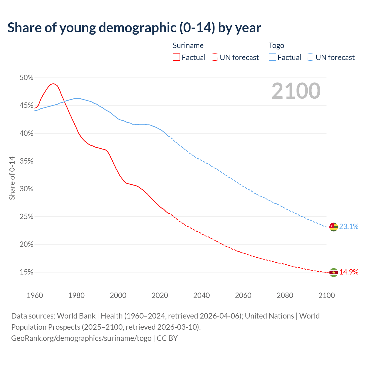 - The share of young demographic (0-15 years old) in Suriname is 25.6% vs 39.5% in Togo.