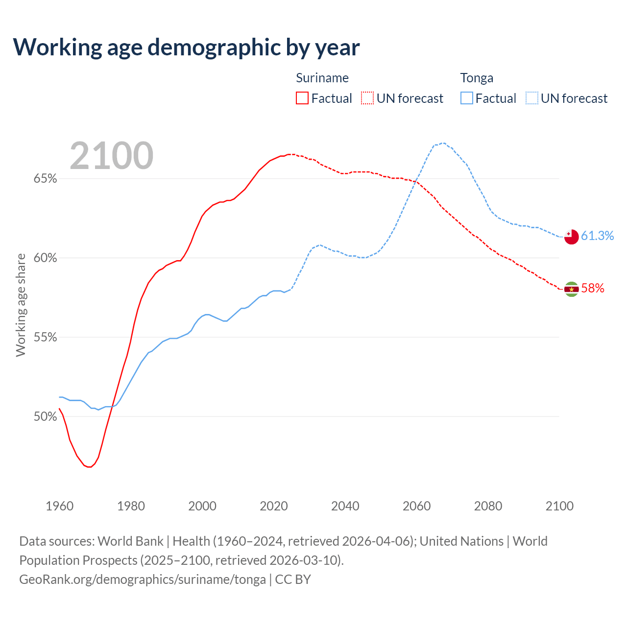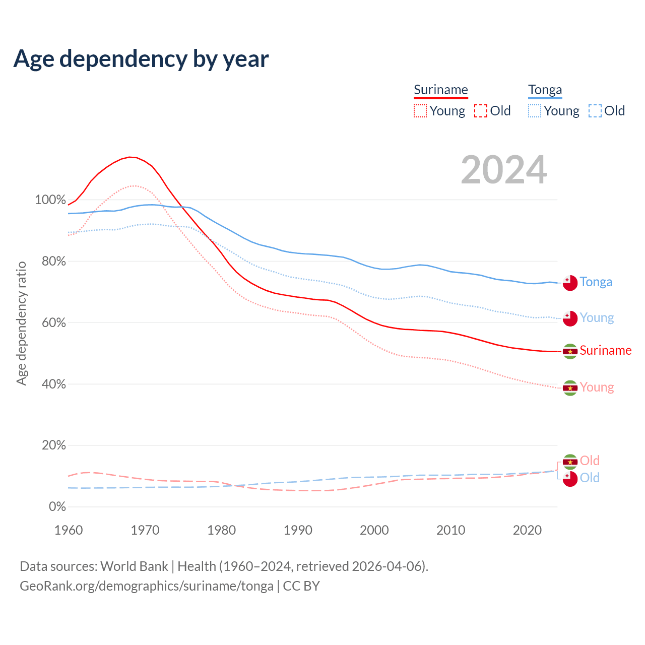 - The share of young demographic (0-15 years old) in Suriname is 25.6% vs 35.4% in Tonga.