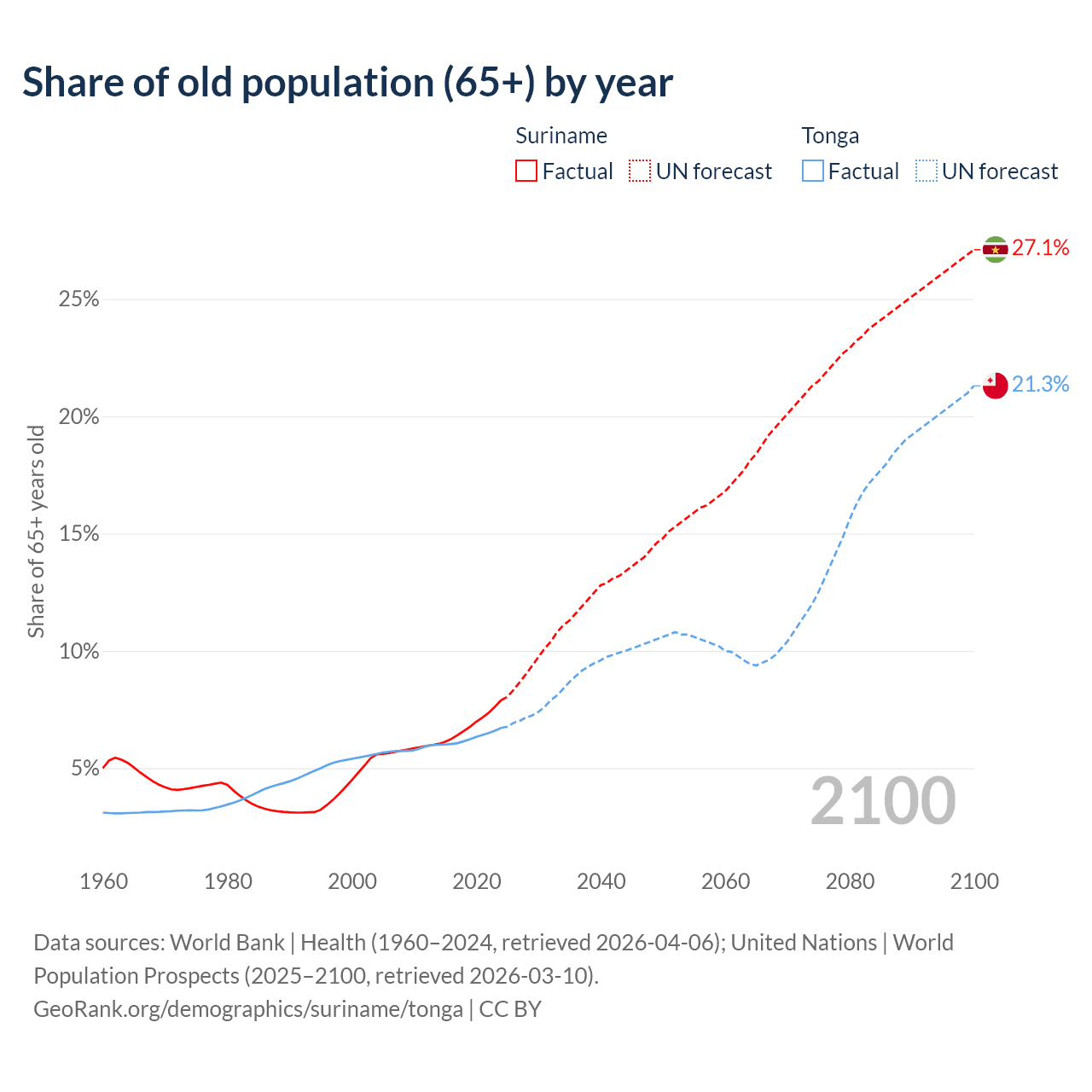 The share of older people aged 65 and over is 7.9% in Suriname and 6.72% in Tonga. Life expectancy in Suriname compared to Tonga .