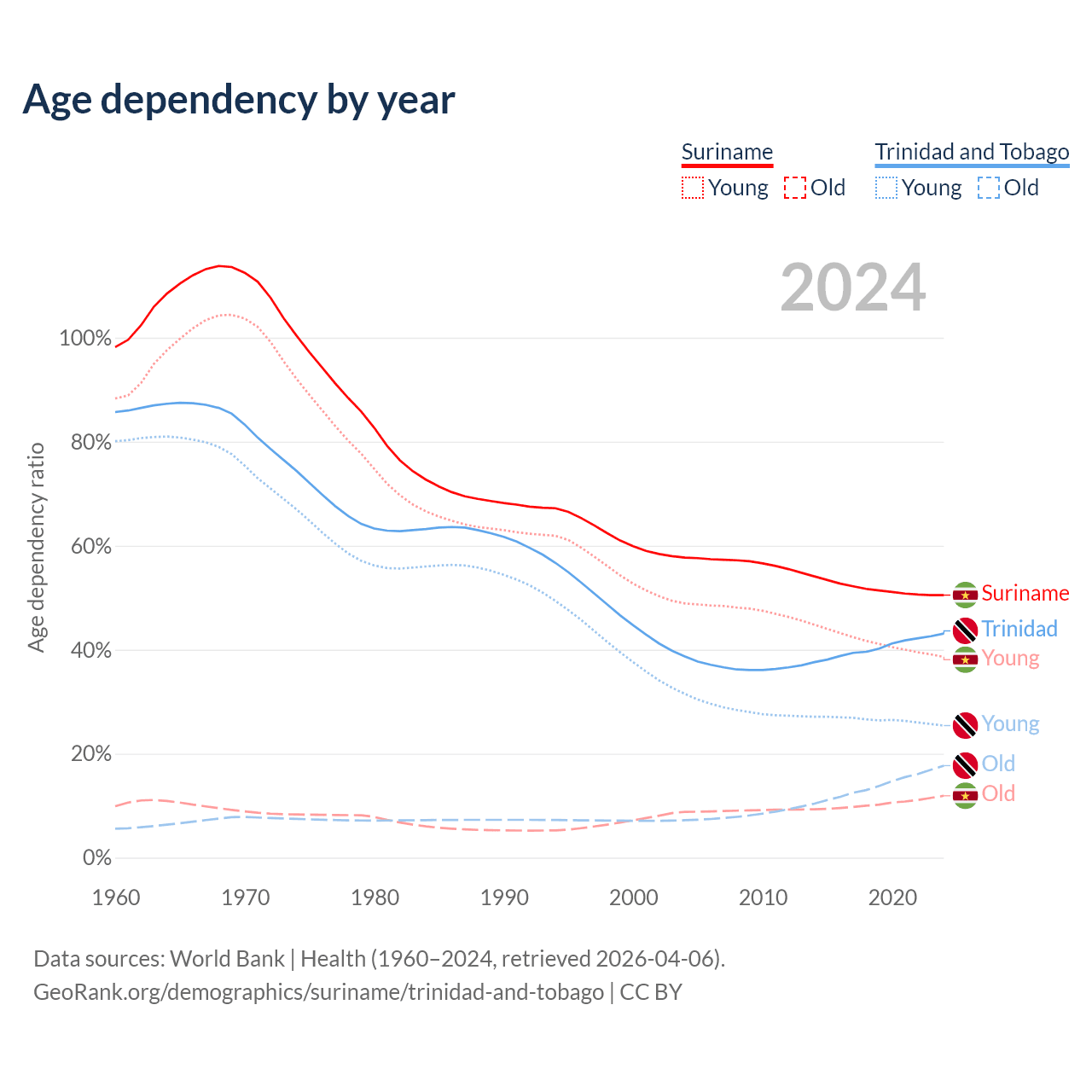 - Suriname is ranked 109/196 by median age (oldest to youngest) vs 58/196 for Trinidad and Tobago.