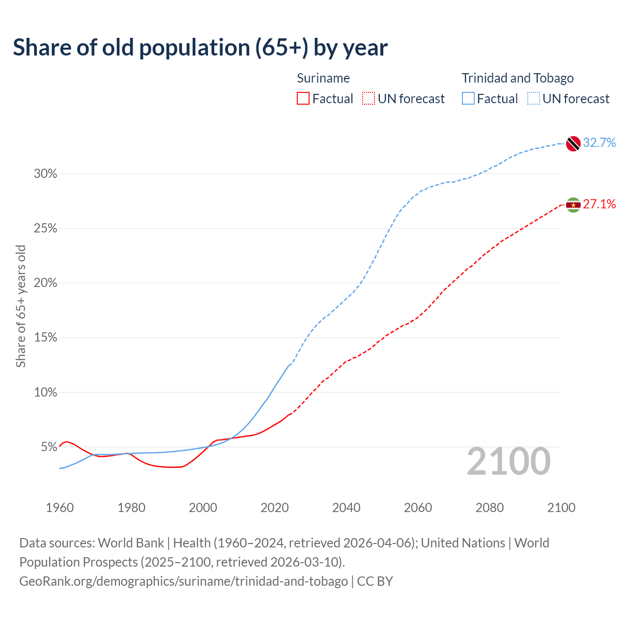 The share of older people aged 65 and over is 7.9% in Suriname and 12.4% in Trinidad and Tobago. Life expectancy in Suriname compared to Trinidad and Tobago .