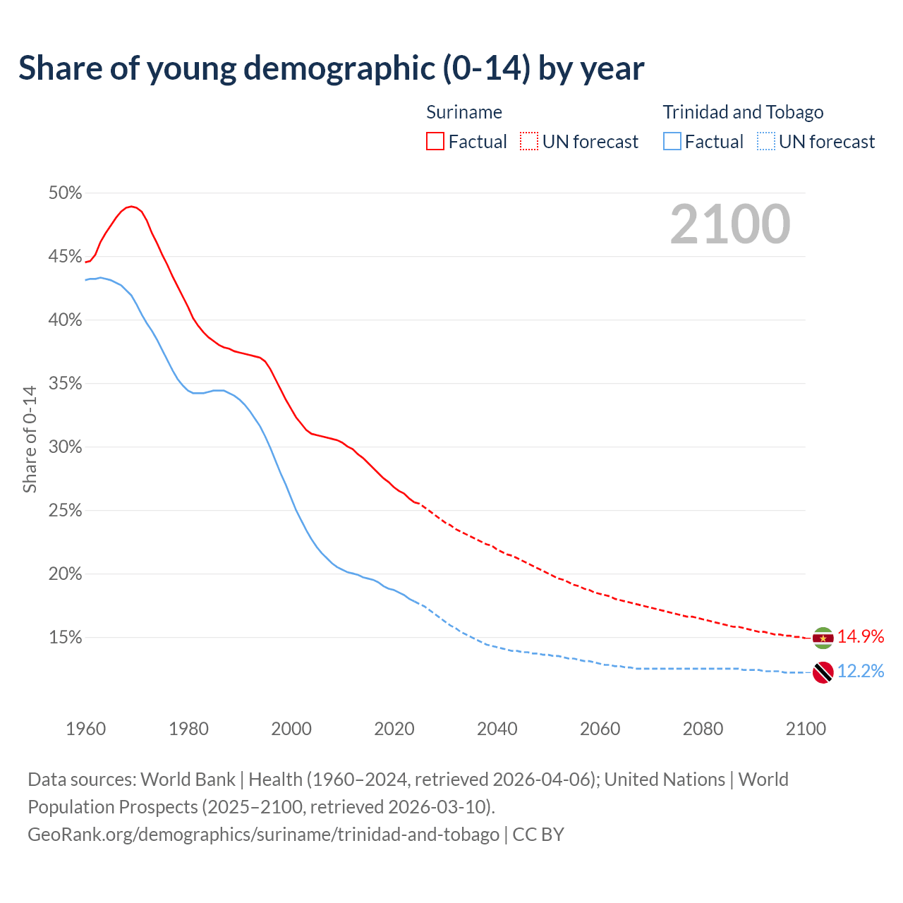 - The share of young demographic (0-15 years old) in Suriname is 25.6% vs 17.8% in Trinidad and Tobago.