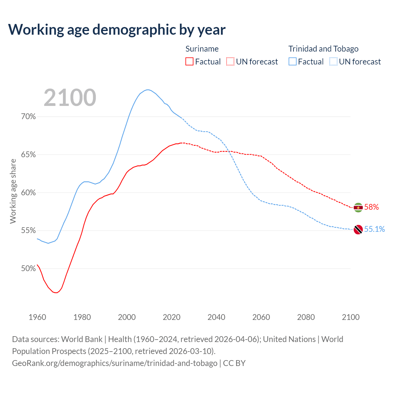 - Suriname has 430K working age adults (aged 15-64) vs 960K in Trinidad and Tobago.