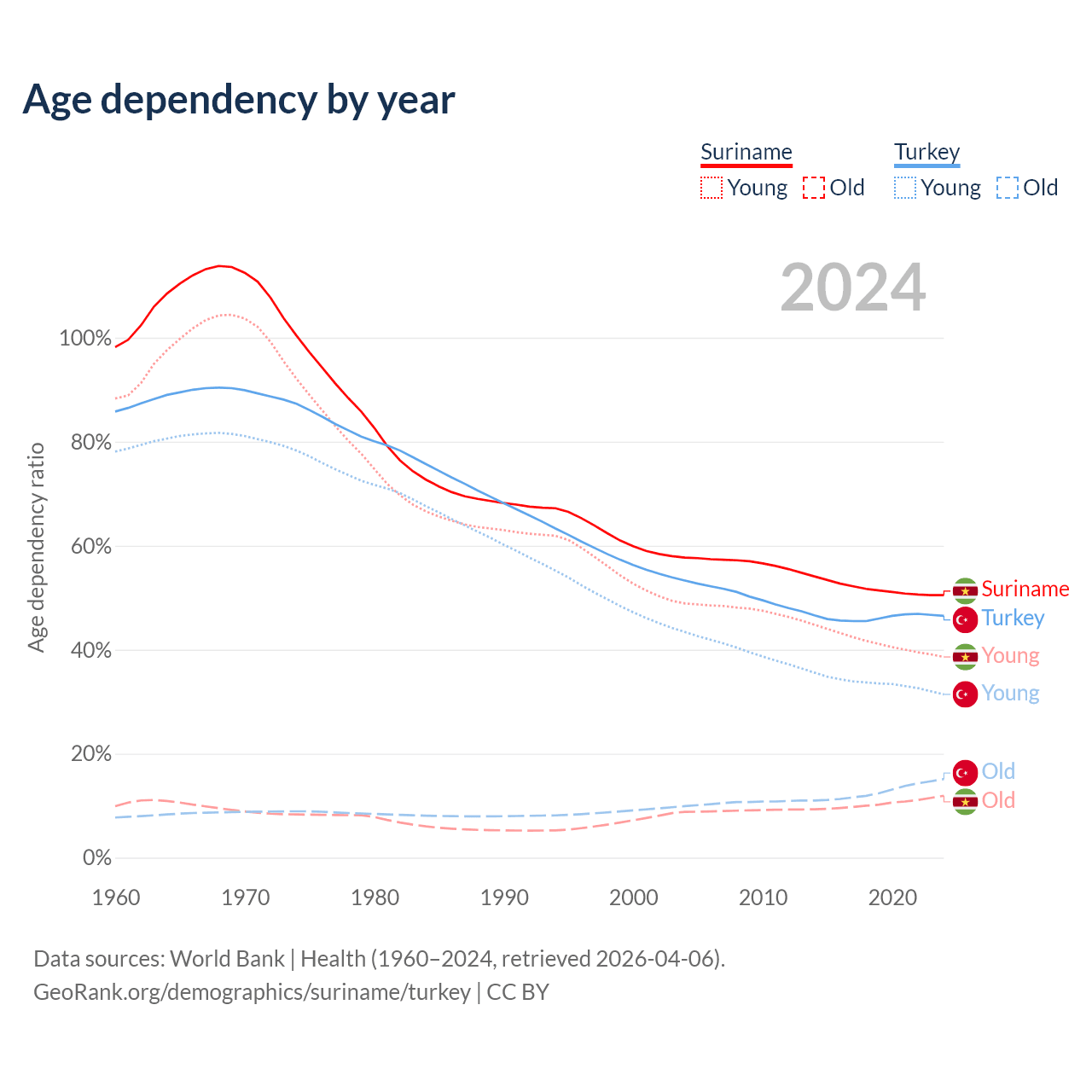 - Suriname is ranked 109/196 by median age (oldest to youngest) vs 83/196 for Turkey.