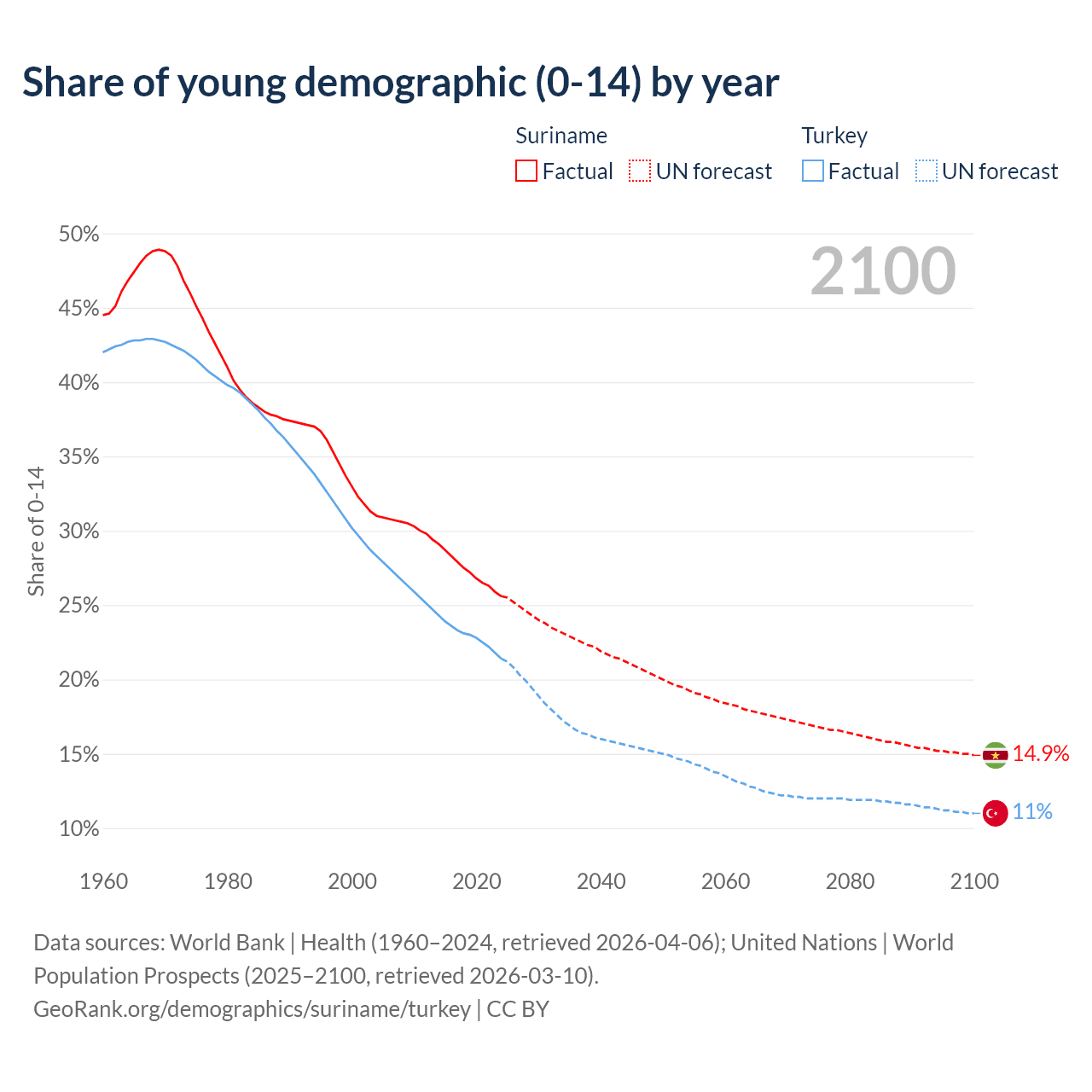 - The share of young demographic (0-15 years old) in Suriname is 25.6% vs 21.4% in Turkey.