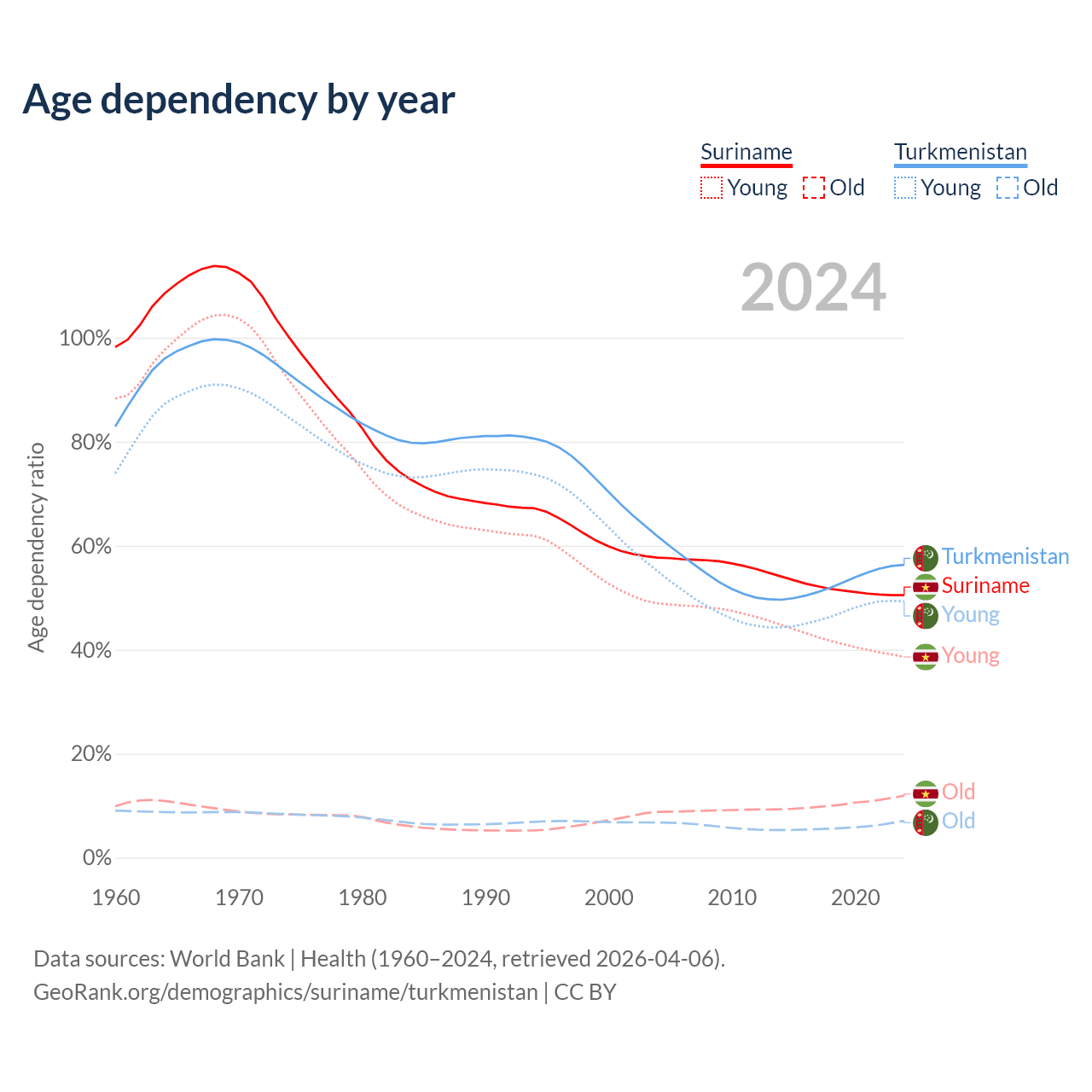 - Suriname is ranked 109/196 by median age (oldest to youngest) vs 119/196 for Turkmenistan.