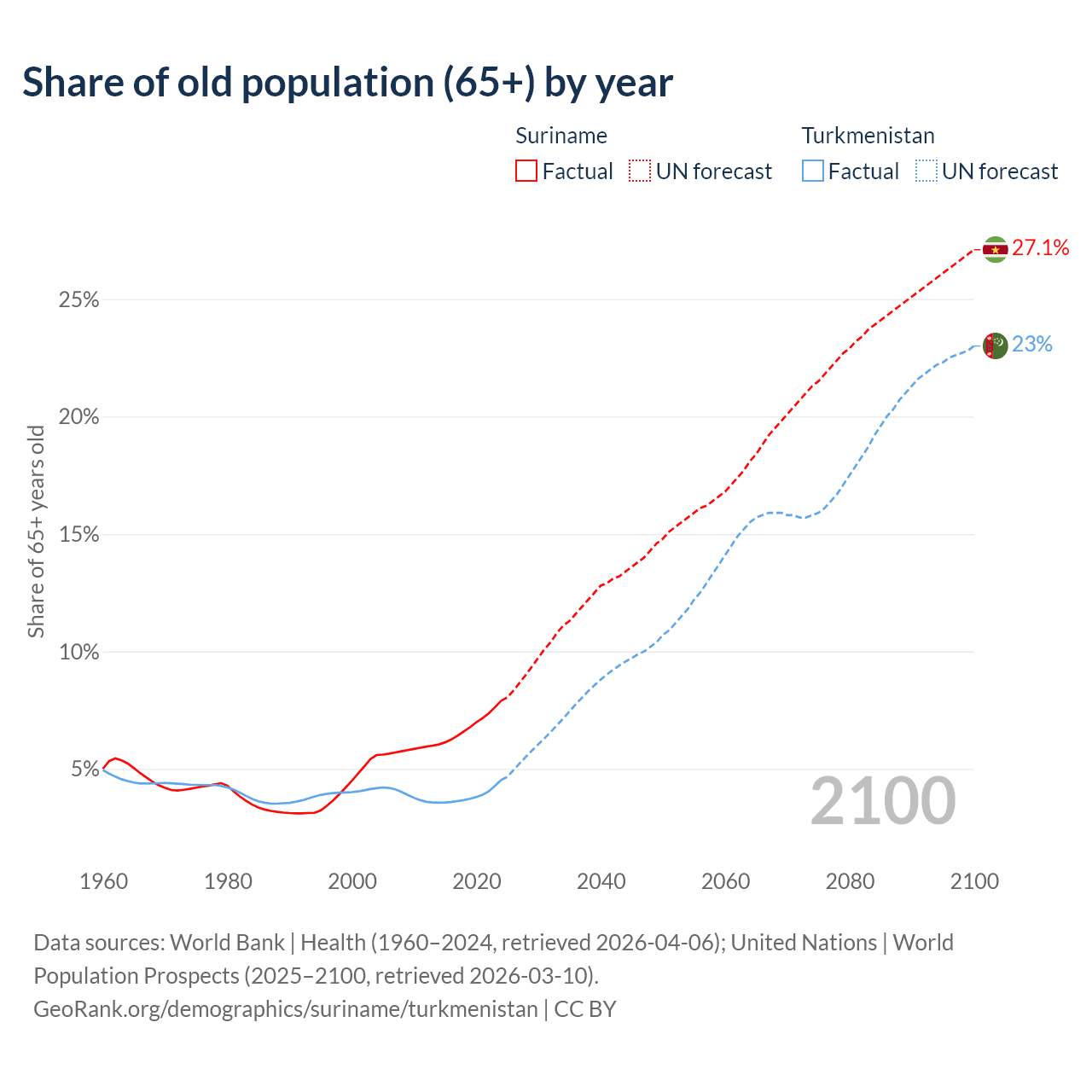 The share of older people aged 65 and over is 7.9% in Suriname and 4.53% in Turkmenistan. Life expectancy in Suriname compared to Turkmenistan .
