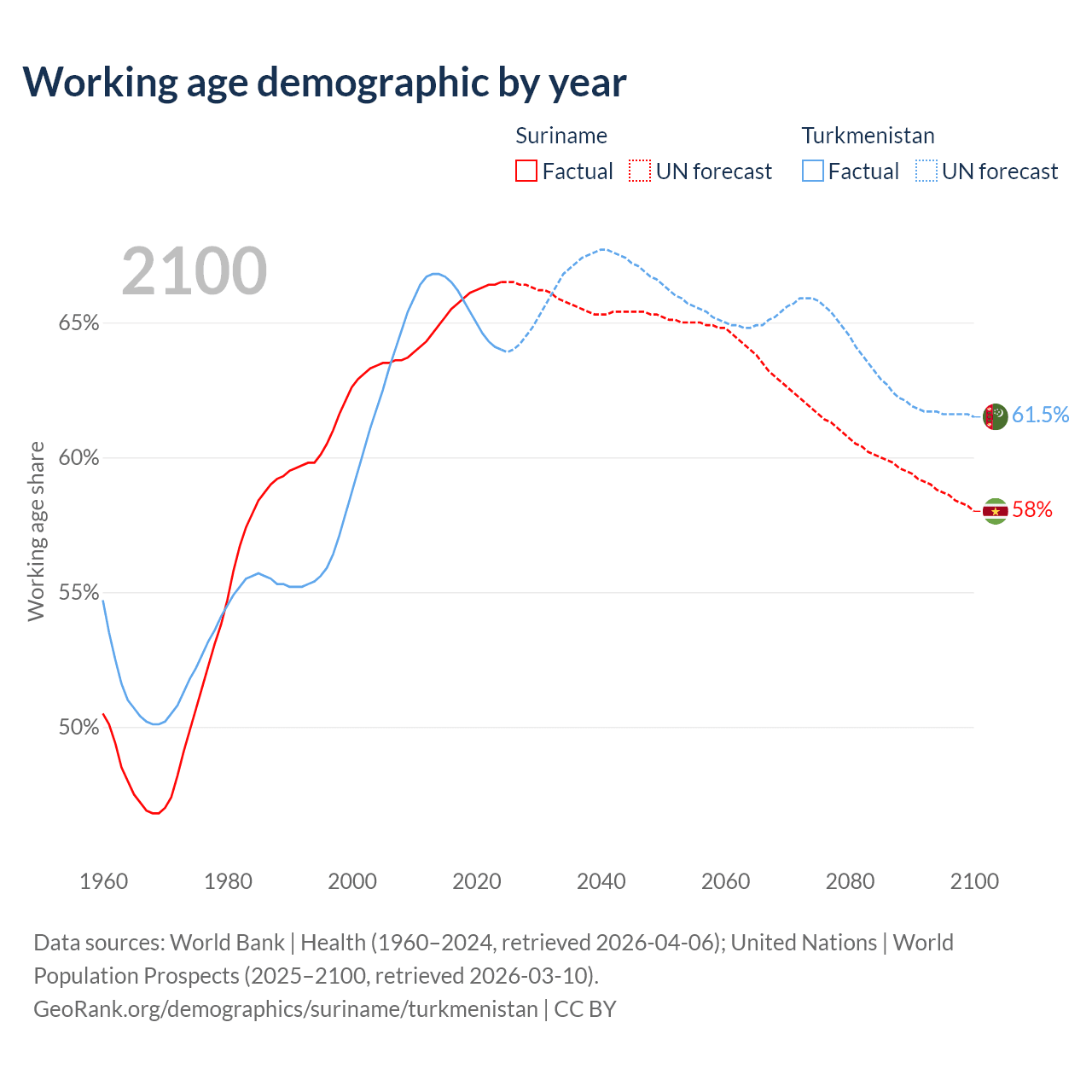 - Suriname has 430K working age adults (aged 15-64) vs 4.97M in Turkmenistan.