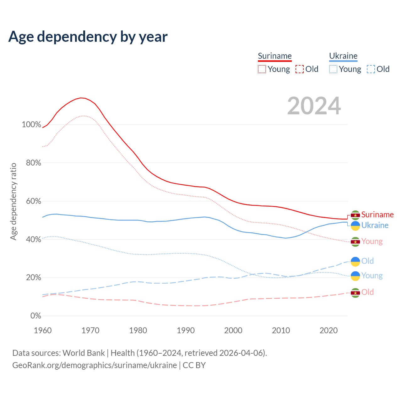 - Suriname is ranked 109/196 by median age (oldest to youngest) vs 26/196 for Ukraine.