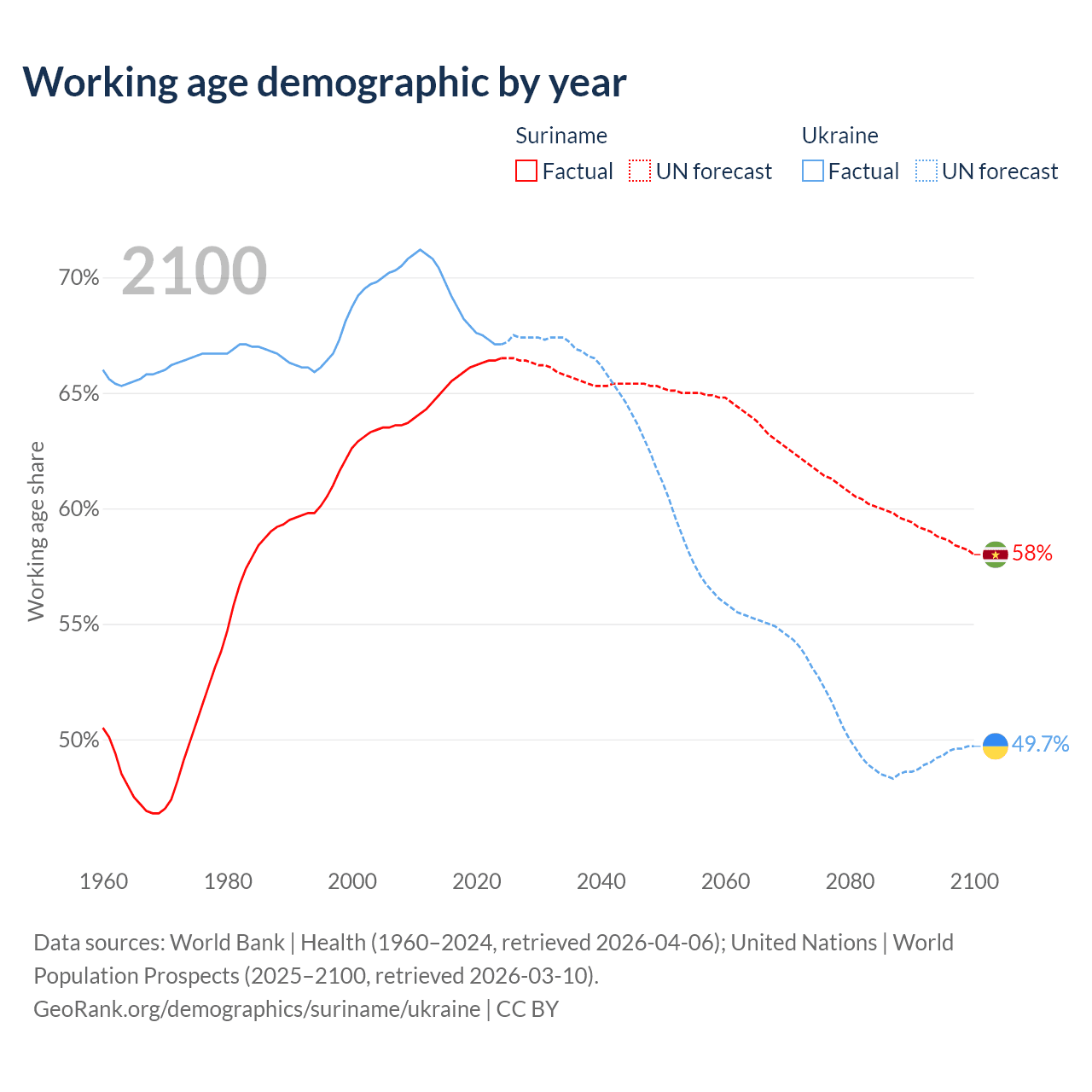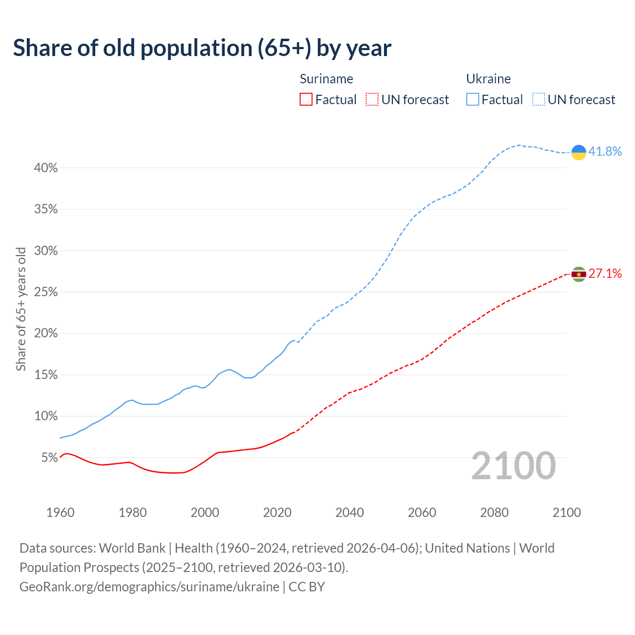 - The share of old-age demographic (65+) in Suriname is 7.9% vs 19% in Ukraine.