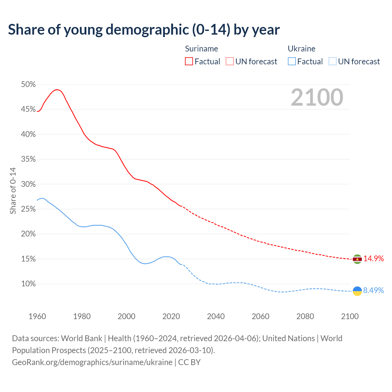 - The share of young demographic (0-15 years old) in Suriname is 25.6% vs 13.9% in Ukraine.